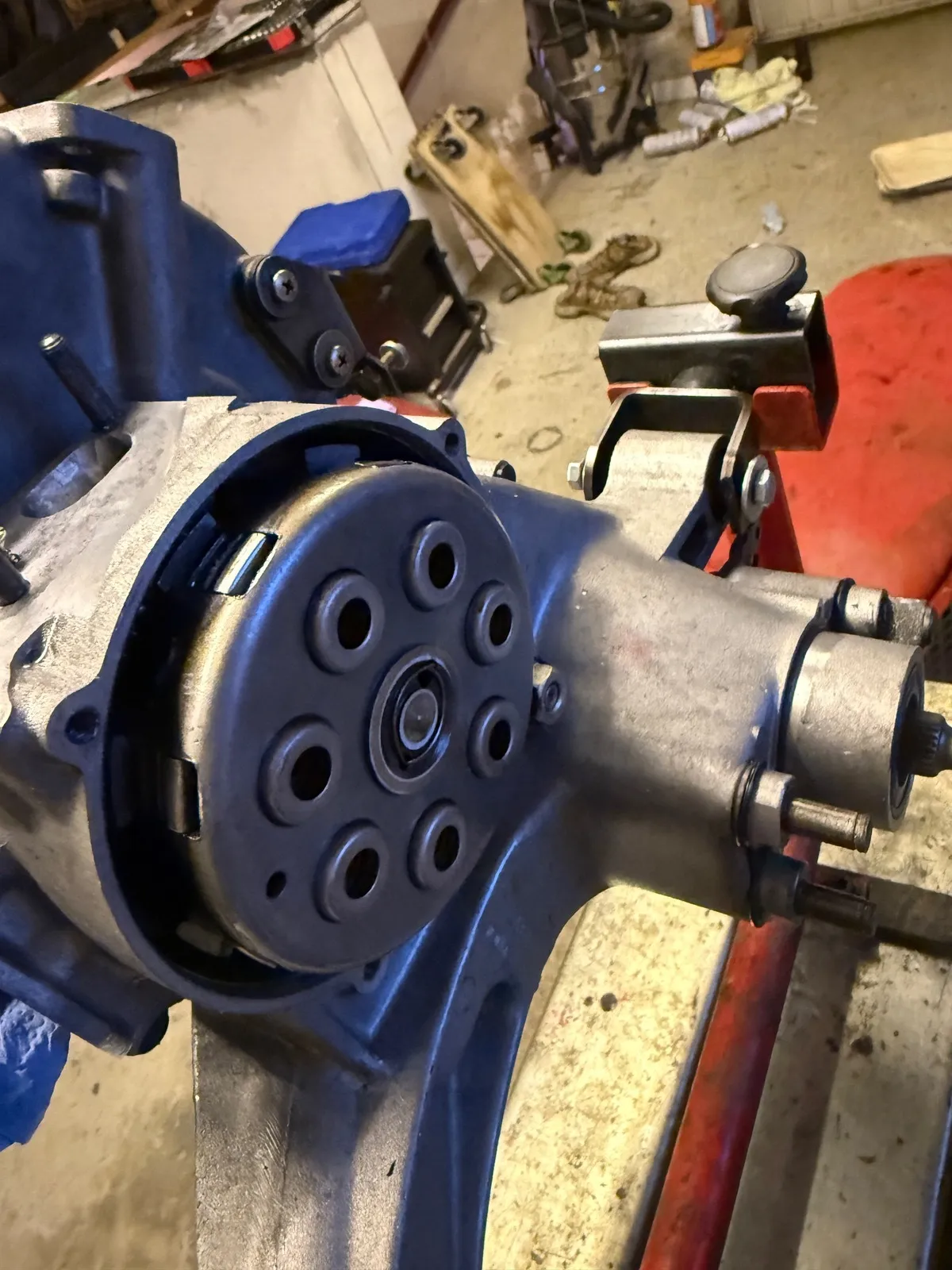Dann gemerkt, dass ich nicht nur in dem Kupplungsdeckel, sondern auch am Gehäuse was wegnehmen muss für die 200er Kupplung. Deswegen und weil ich die Distanzscheibe erst vergessen habe insgesamt dreimal die Prozedur mit dem Einbauen der Kupplung … hab ja Zeit heute.