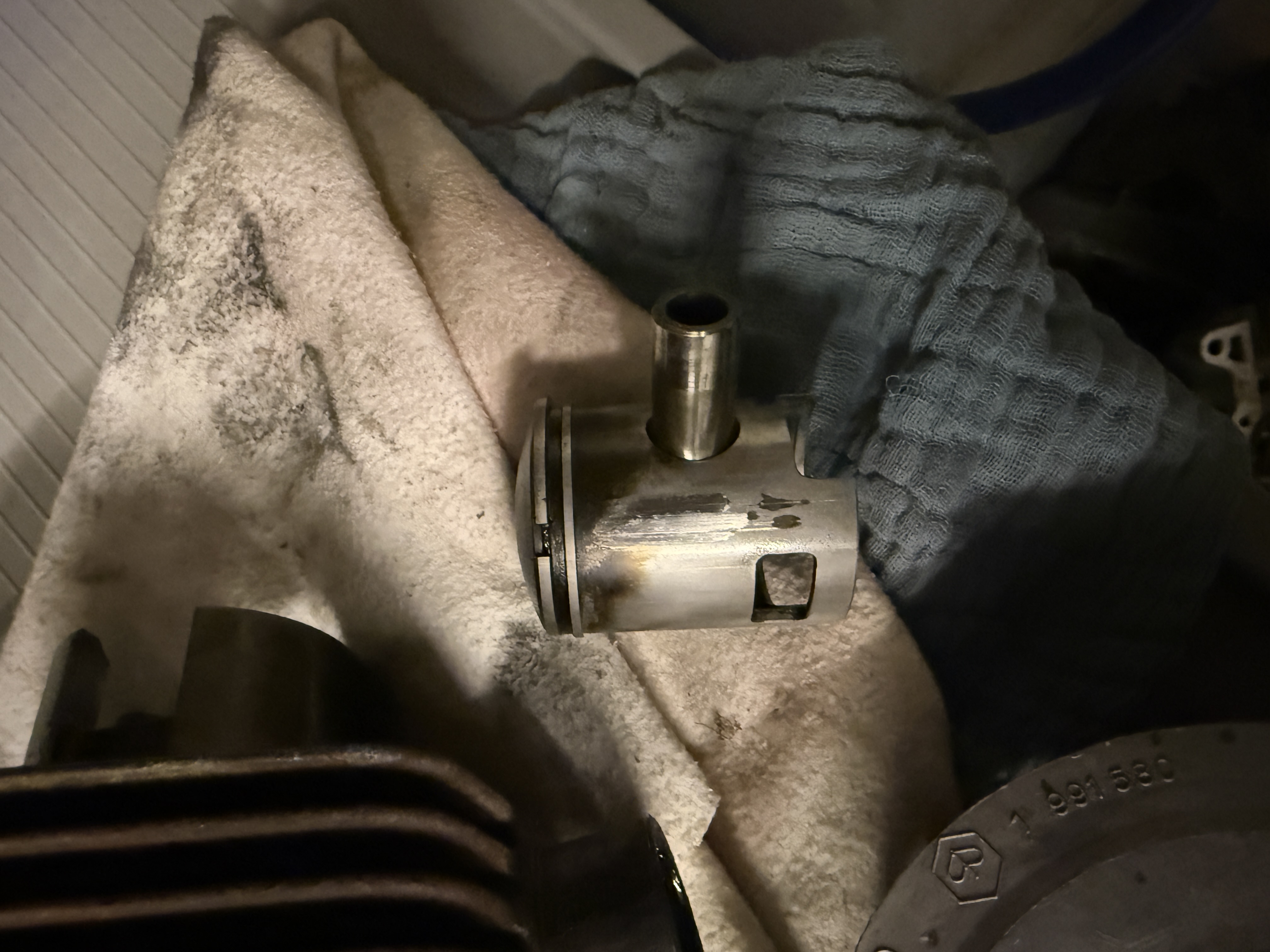 Als ich die Antriebswelle rausgekloppt habe, ist der große Simmerring am Kurbelgehäuse gleich mit rausgeflogen.Der Kolben wies auch ein paar Klemmspuren auf. Der Zylinder allerdings sah unauffällig aus.