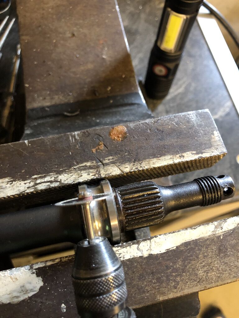 Ich habe dann die Antriebswelle zunächst in die falsche Richtung geschlagen. Da kam dann das Kugellager im Ganzen mit raus, so gerade eben bis außerhalb des Motorgehäuses. Dann hab ich den großen Ring des Lagers mit der Minifräse mit kleiner Trennschreibe aufgeschnitten fast bis zum Gehäuse, den Rest dann mit einem Schraubendreher und Hammer einfach gesprengt.
