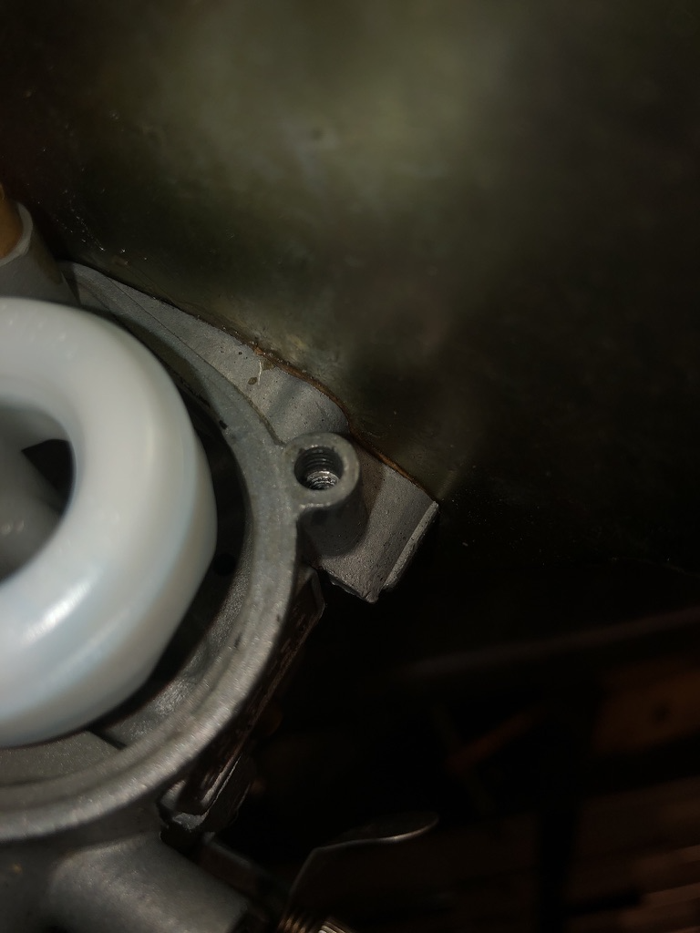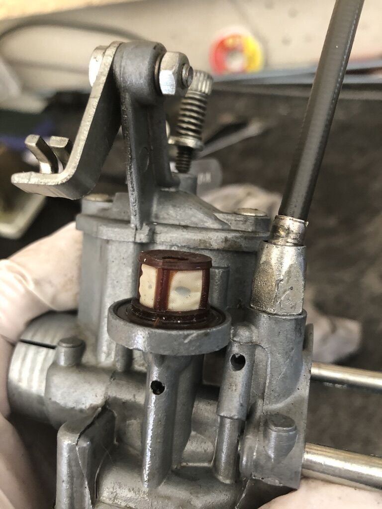 Irgendwann hab ich an der V50 S dann doch einmal nach dem Fehler gesucht. Vergaser ausgebaut und festgestellt, dass die Schwimmerkammer nicht dicht war. Das Gewinde einer der beiden Schrauben war herausgerissen. Zudem hatte der Benzinfilter offensichtlich auch seine besten Zeiten lange hinter sich. Interessant war auch, wie die Rückstellung des Gasgriffs gelöst war: da war einfach ein Plättchen auf dem Arm des Vergasers, wo der Gaszug eingehängt ist, und dieses Plättchen wurde mit einem Gummiband irgendwo anders fixiert. So drehte der Gasgriff wieder zurück, obwohl dort bei der V 50 S keine Feder eingebracht ist. Original ist das bestimmt auch nicht.