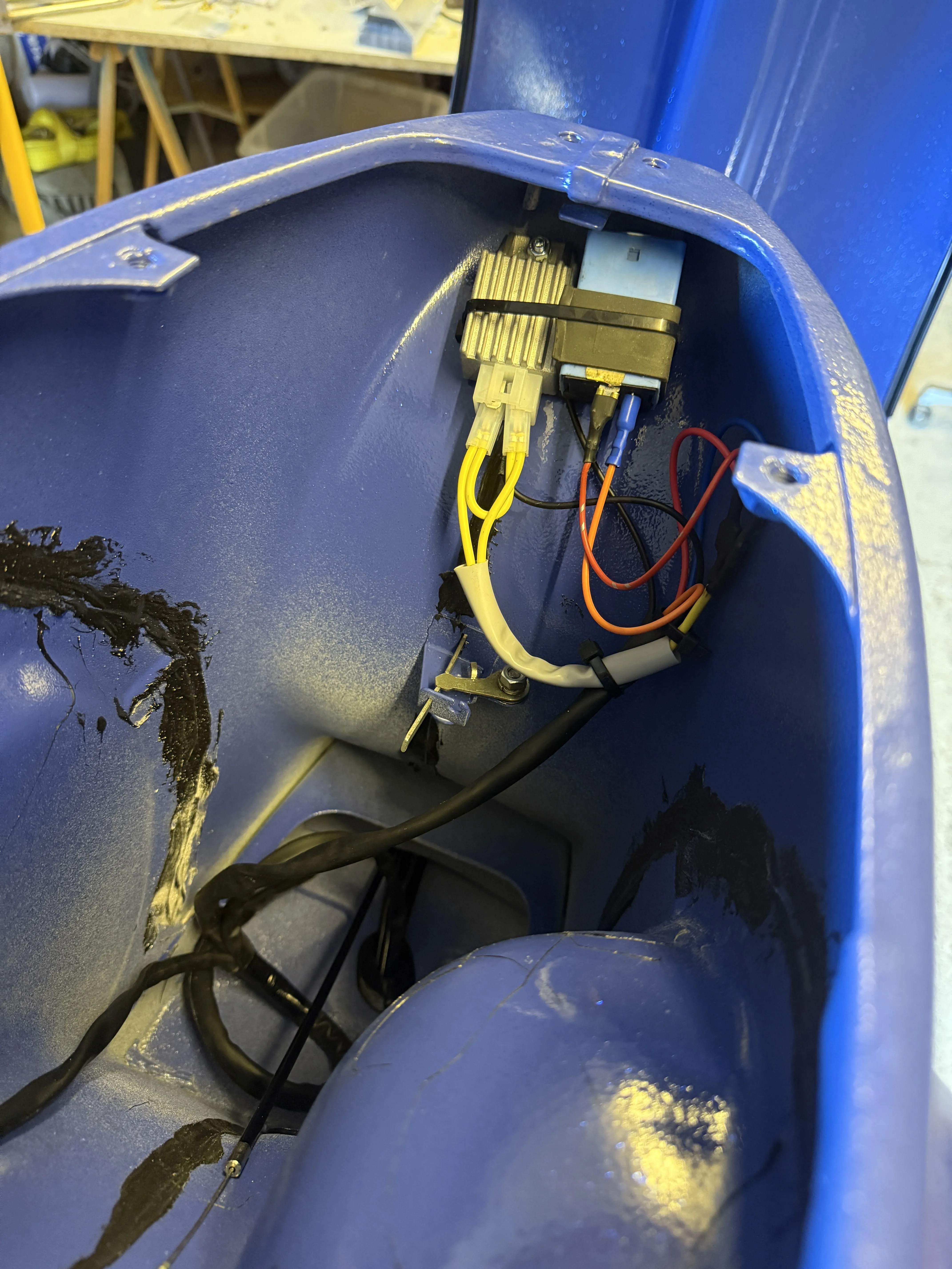 Hab die Elektrik innen eben einmal komplettiert. Das Fach etwas mit dem Heissluftfön bearbeitet und minimal verformt, dann passt das auch rein.