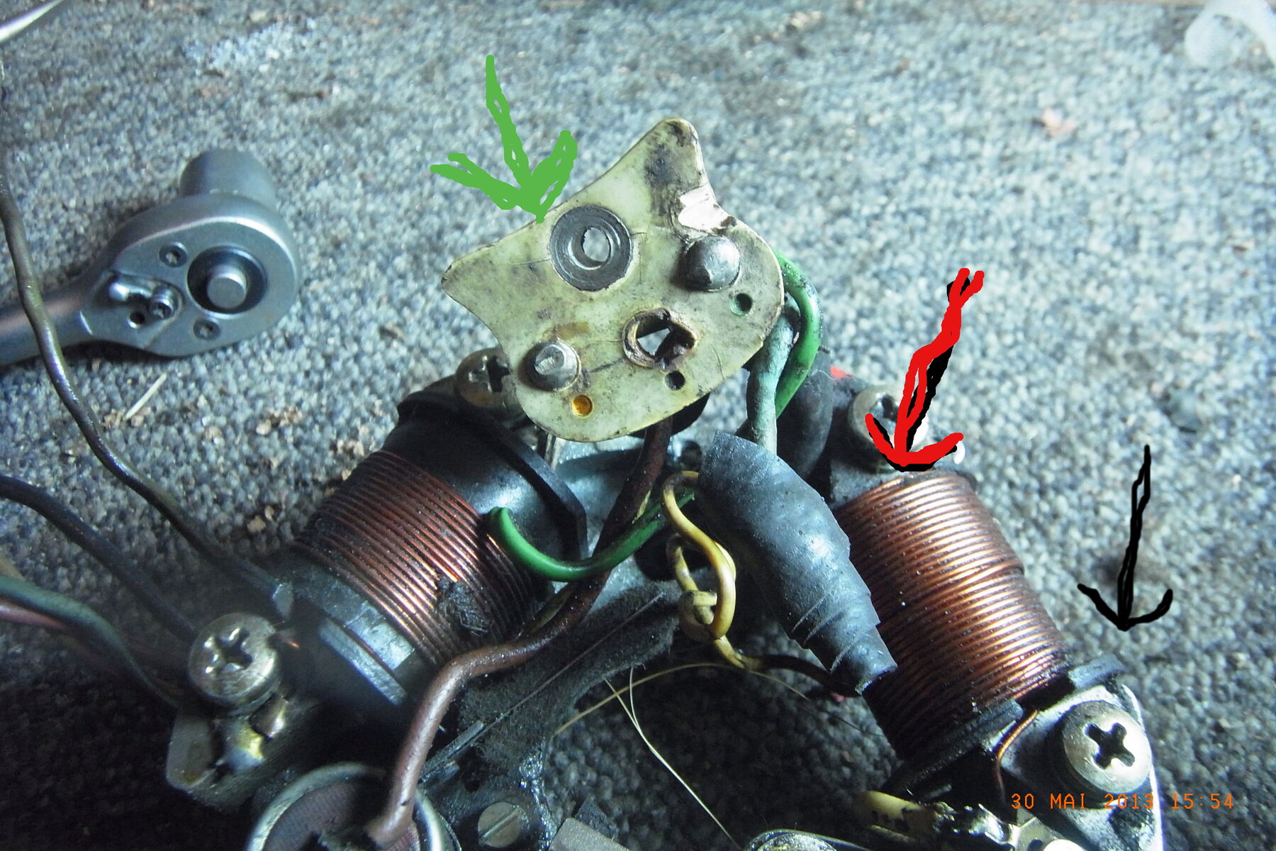 Servus habe diese 6V ZGP und es kommt kein Zündfunke. Kann es sein, dass wenn an der Seite der Spulen der Isolator(schwarzer Pfeil) abgebrochen/abgerissen(roter Pfeil) ist eine neue Spule nötig ist?