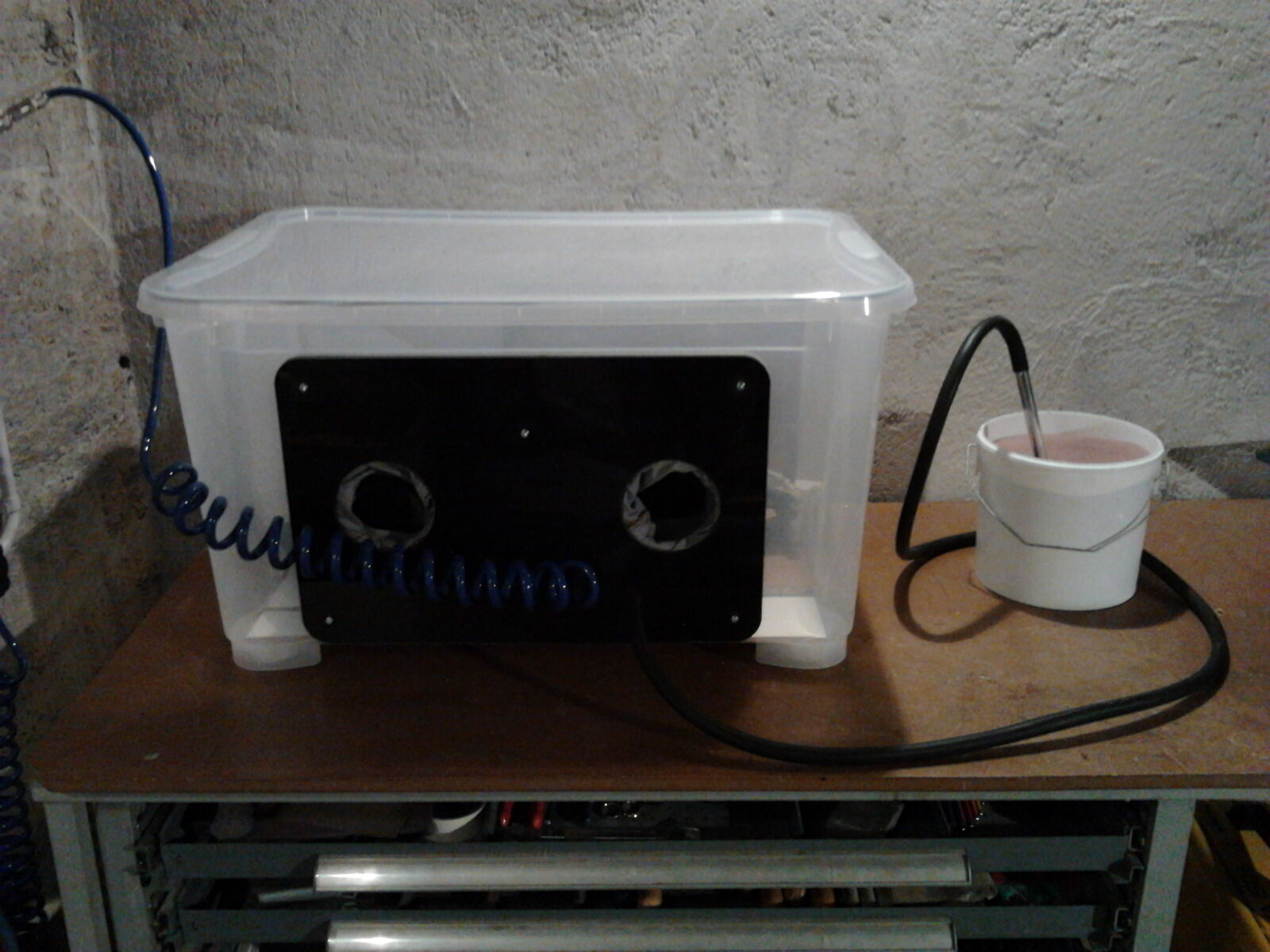 Diese Woche habe ich c.a 50m Pressluftschlauch verlegt und (provisorische?) Sandstrahlkabine gebaut.