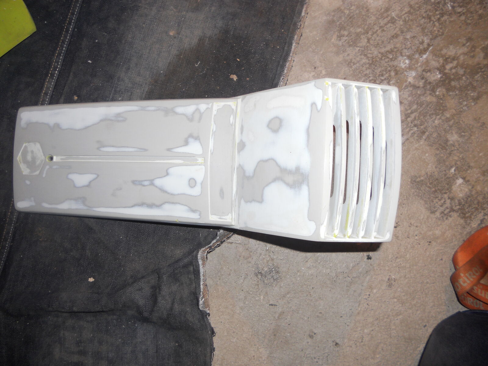 Letzten samstag habe ich die nase (kaskade?) und die Lenkerabdeckung bis auf die Grundierung Abgeschliffen. war viel Arbeit. Zum glück muss ich die Metallteile nicht schleifen