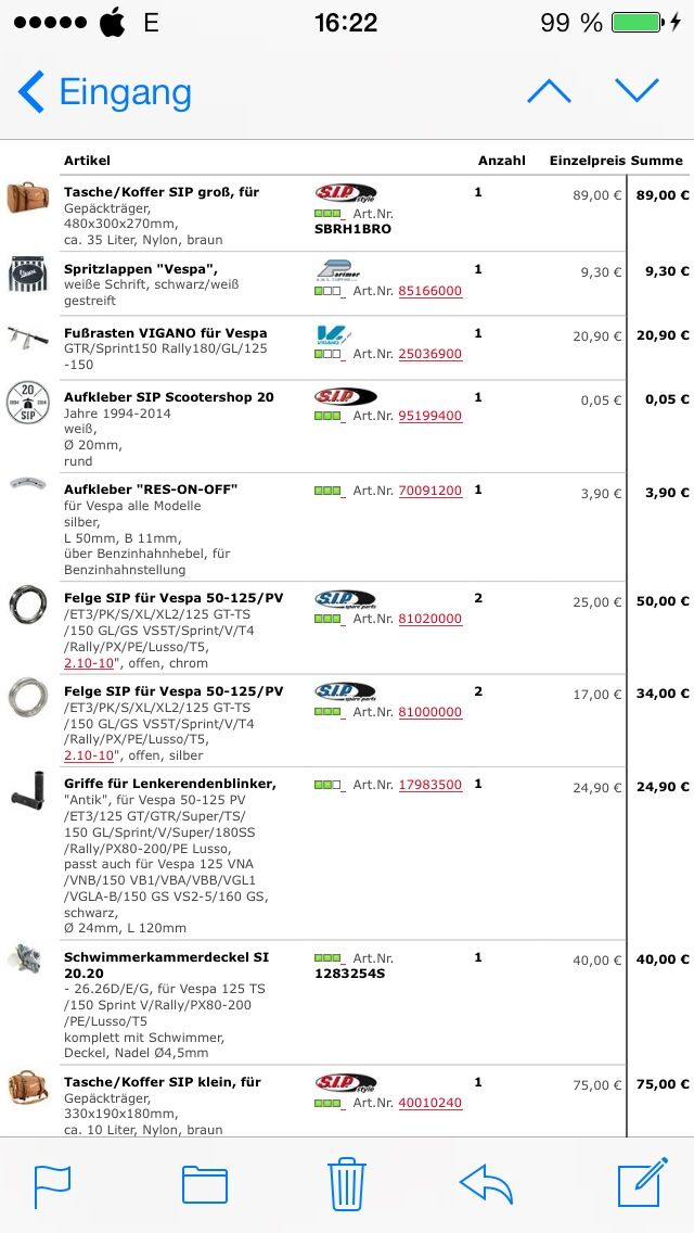 So Vespa steht bei mir zuhause, jetzt brauch ich allerdings noch 2 Dichtungen, die der Schrauber nicht besorgen konnte.