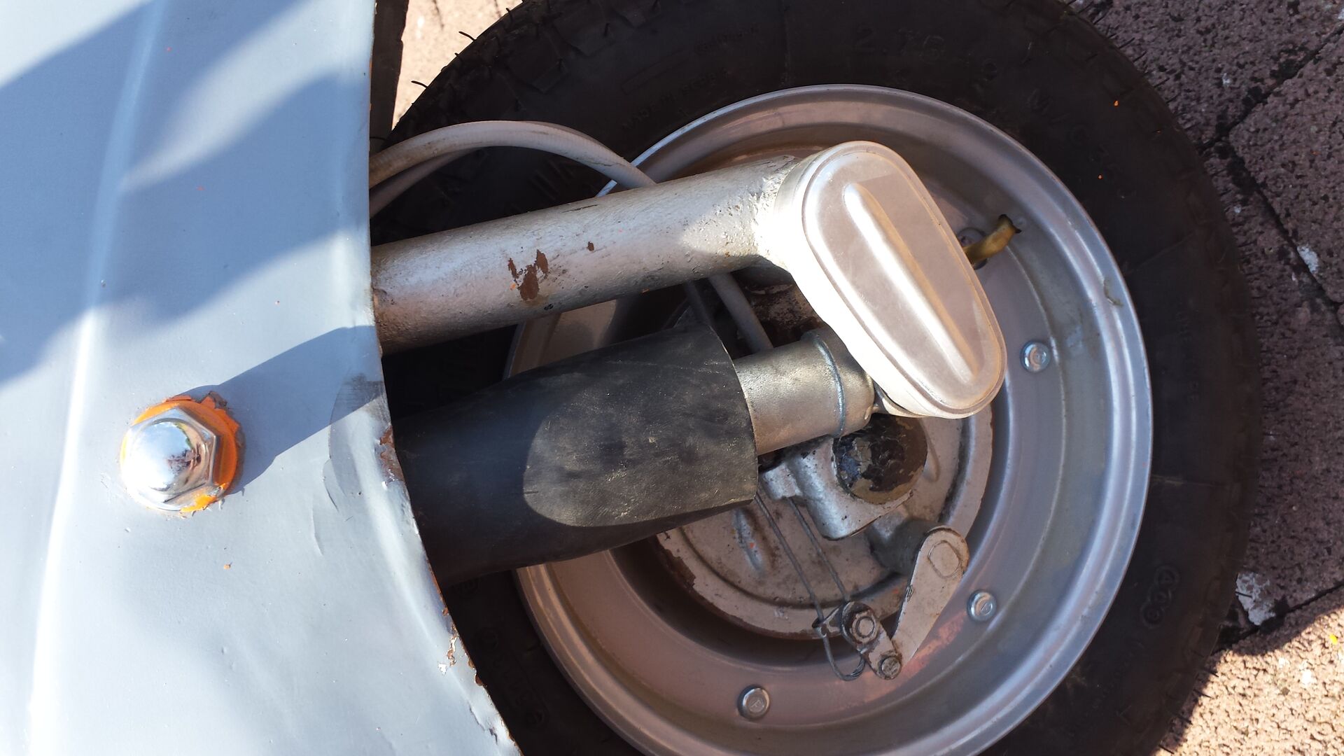 Anbei mal ein Foto vom neuen Stoßdämpfer. Ist der richtig drin? Die schwarze Abdeckung hängt soweit unten.