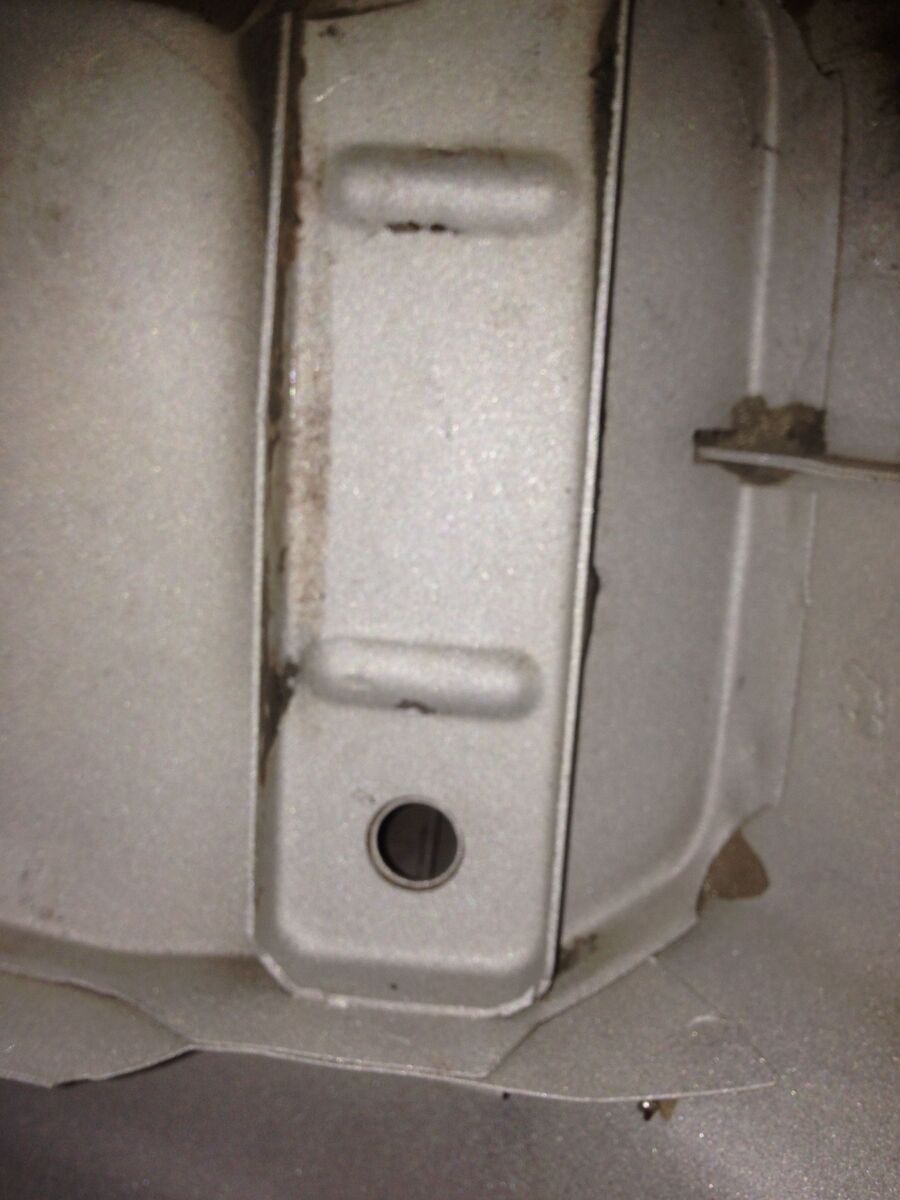 Der Dämpferträger sieht noch O.K. aus, aber auch dort sind an den 2 Ausbuchtungen 2 Löcher.