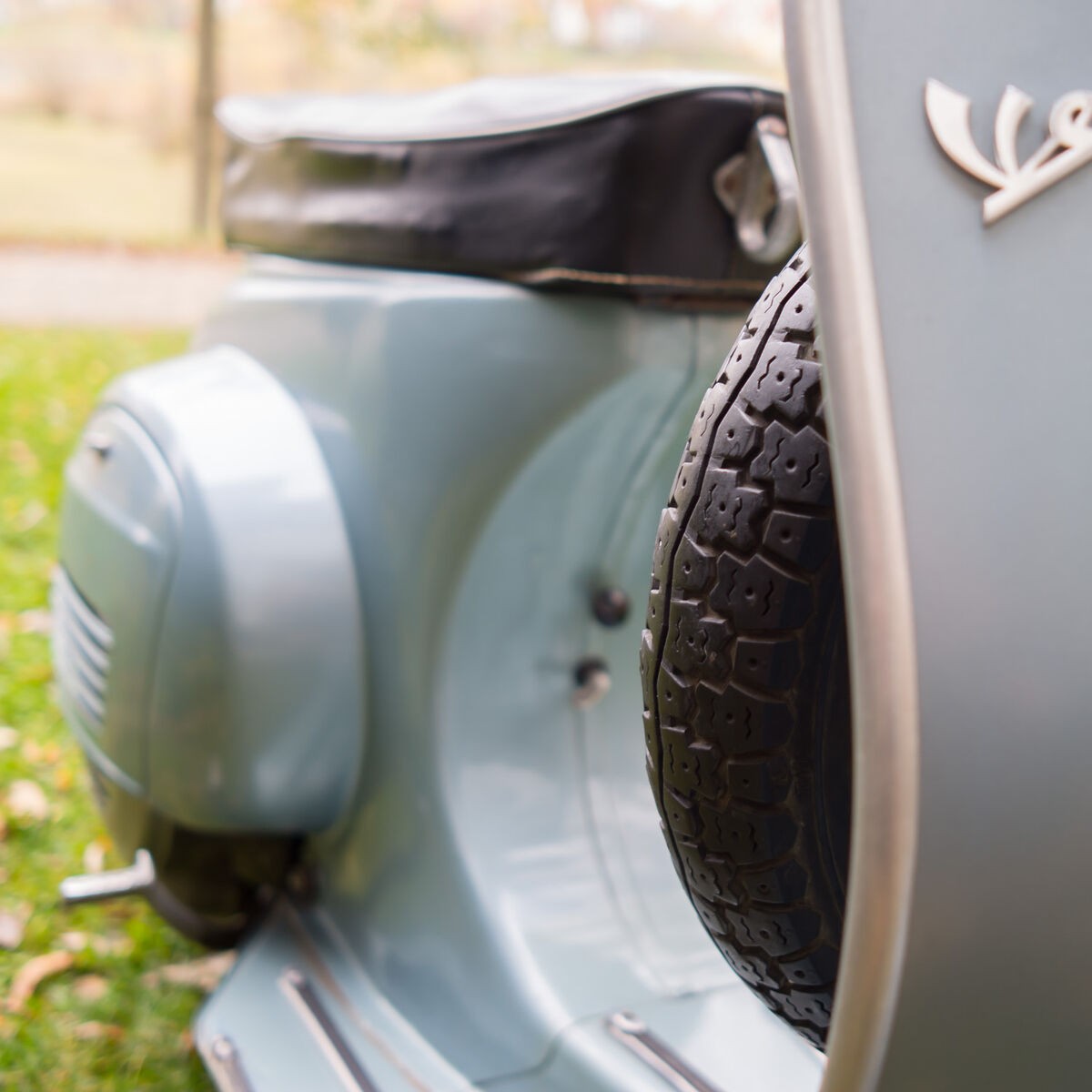 Das ist das montierte Reserverad. Scheinbar ein Felgensilber-Opfer. Zudem ist der Reifen nicht mehr zu gebrauchen. Ich möchte nun eine patinierte Felge samt neuem ACS dort anbringen. Woher kann ich so eine 9" im passenden Zustand zur Vespa bekommen?