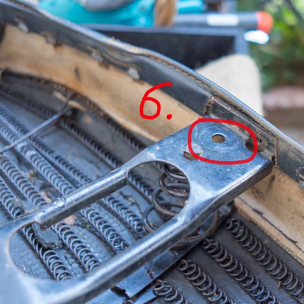 Die Sitzbank: Sie hat einen Riss, zudem ist die Leiste, in der mittig die Federn eingehangen sind, gebrochen (7). Es fehlt außerdem ein Gummipuffer (6).