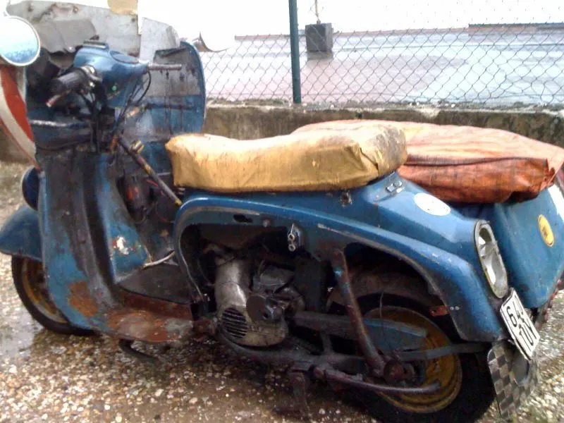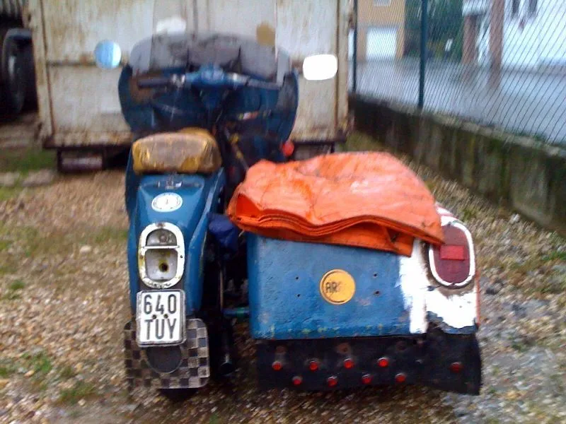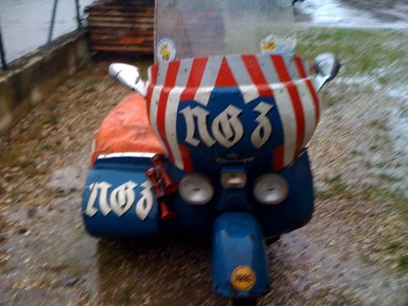 Den dezenten Aufklebern nach zu urteilen hatte das Gerät irgendwann mal mit der Neuss-Grevenbroicher Zeitung zu tun. Vielleicht zum Zustellen benutzt, wobei die Zeitungen im Beiwagen lagen?