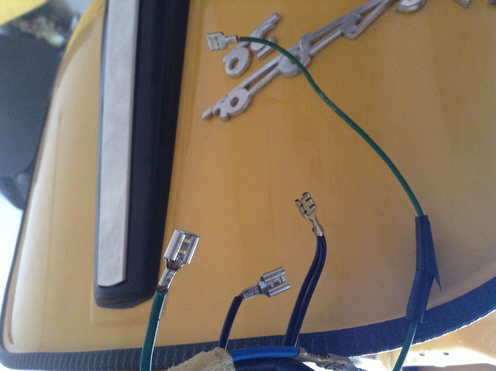 Ich habe jetzt insgesamt noch 3 freie Anschlüsse: der oberste Anschluss ist wenn ich das richtig nachgelesen habe für die Abblendlicht-Soffitte die es noch bei italienischen Modellen gibt, dann der Anschluss direkt am mittleren Lämpchen (Pluspol) wo meine grünen Kabel angeschlossen werden und dann noch die letzten 2 Anschlüsse am Scheinwerfer-Gehäuse welche man auf den beiden Bildern sieht.
