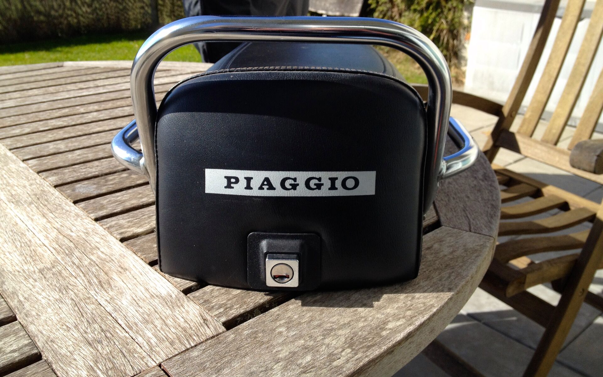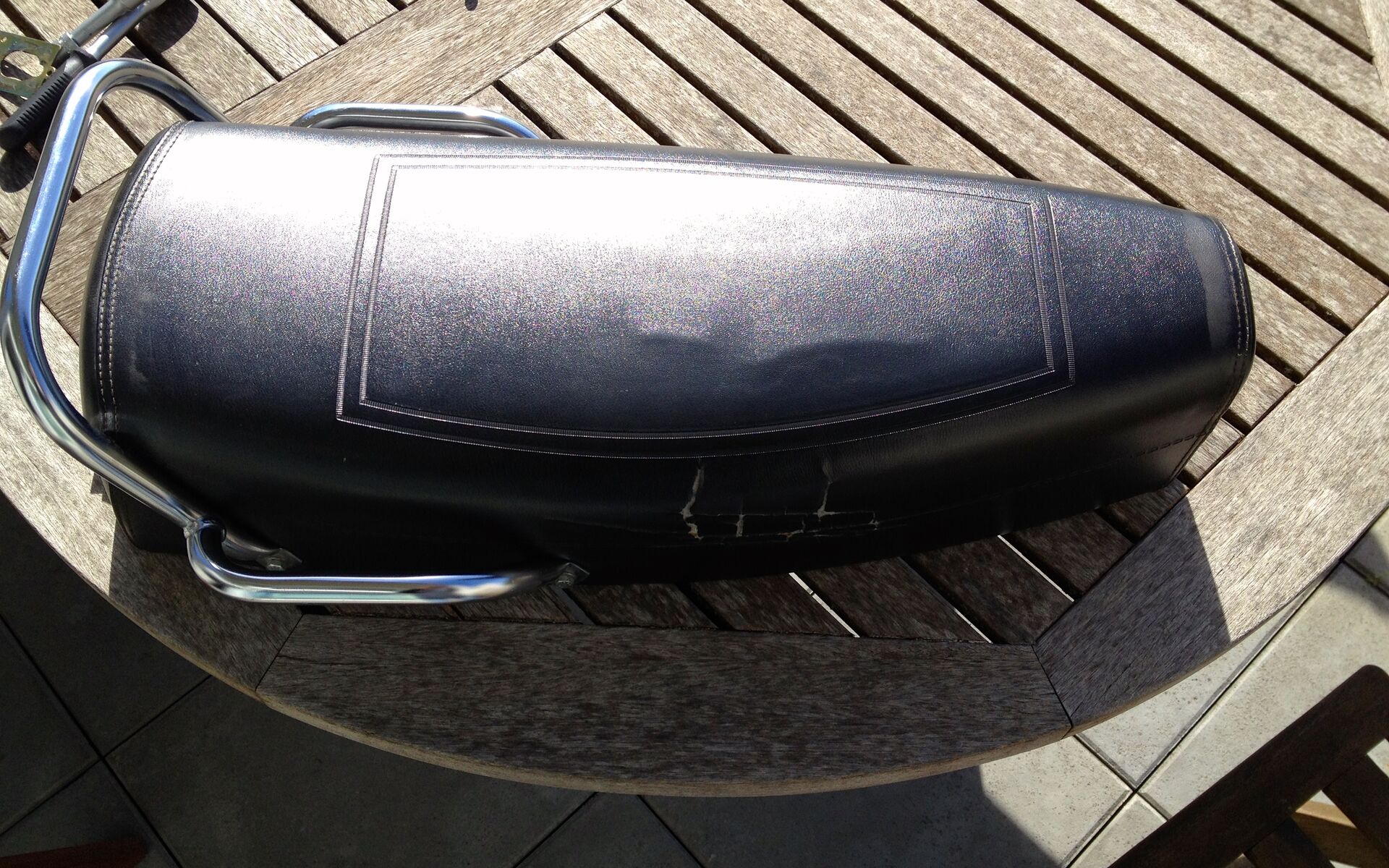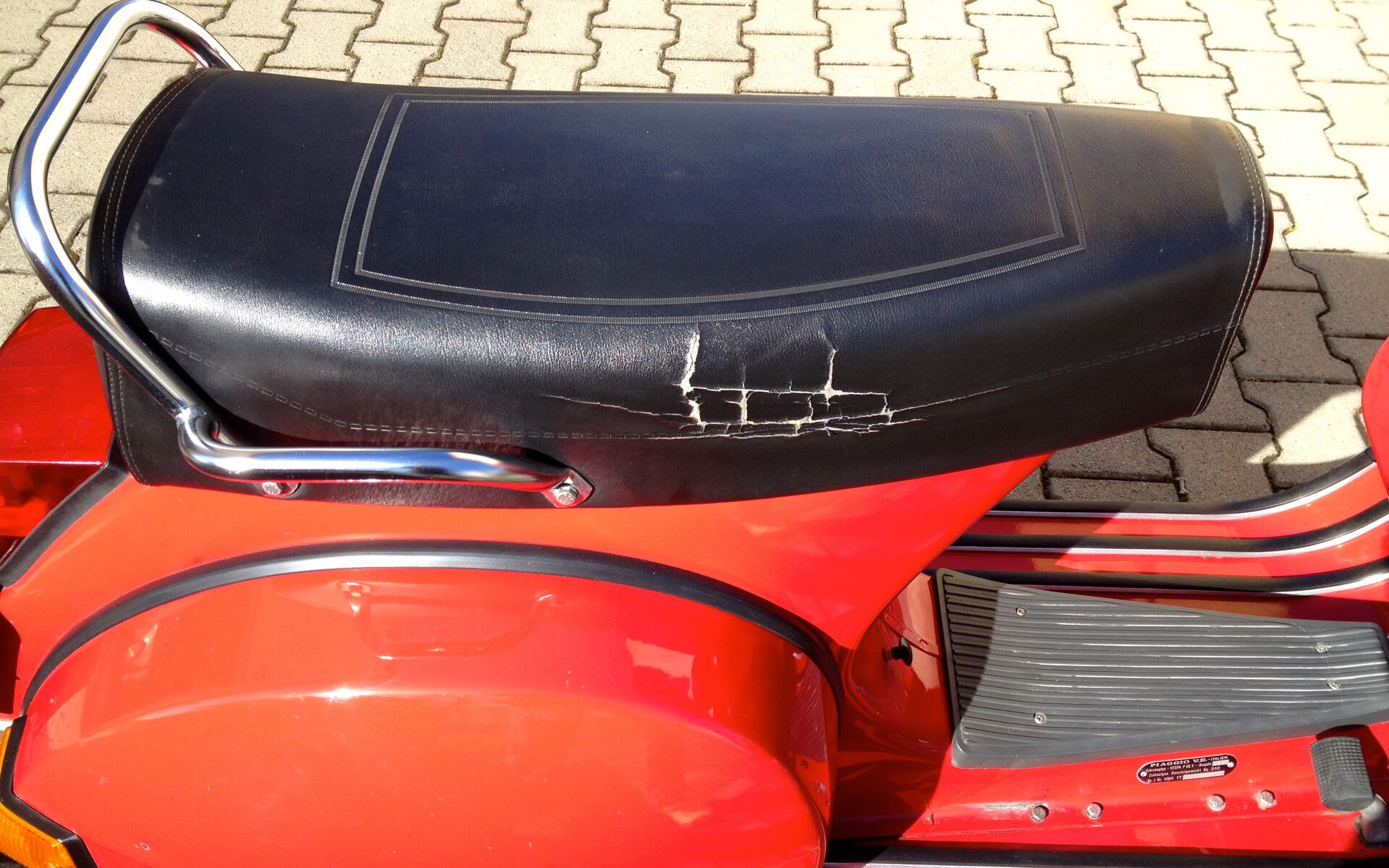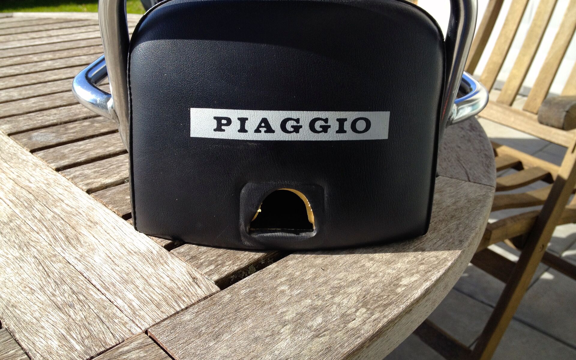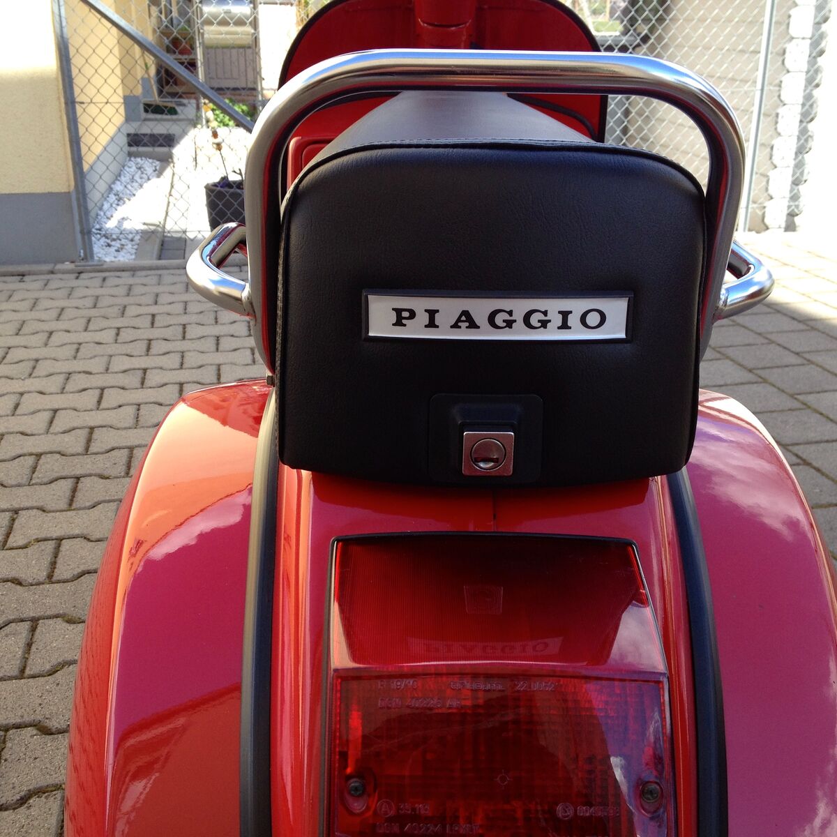 Auf dem Sitzbankbezug der ursprünglich montiert war prangt hinten oberhalb des Sitzbankschlosses der Piaggio-Schriftzug als weißer Druck mit schwarzer Schrift. Das gibt es so nicht mehr bei den Ersatzbezügen. Im Piaggio-Prospekt von 1993 ist der Schriftzug als Aufkleber auf einem Plastikunterteil angebracht. Dieses Plastikunterteil hat 3 "Höcker" mit welchen es an der Sitzbank befestigt wird (Je eine Schraube li u re, der mittlere Höcker bleibt unbelegt). Mein Sitzbank ist aus Plastik und nicht wie die Sitzbänke der PX alt aus Drahtgestell und hatte keine entsprechenden Löcher um den Plastikschildhalter aufzunehmen. Den neuen Sitzbankbezug gibt es als Ausführung PX alt mit 3 vorgestanzten Löchern für den Plastikhalter, aber das Muster auf der Sitzbank stimmt dann nicht. Der Sitzbezug für die PX Lusso hat zwar das richtige Muster, aber keine vorgestanzten Löcher