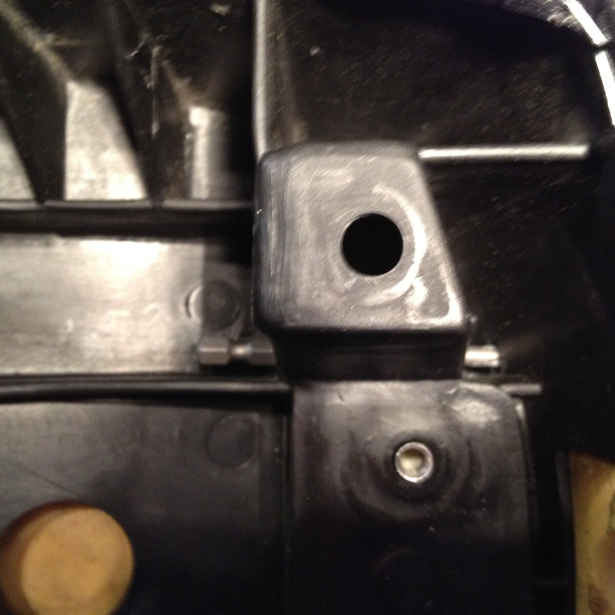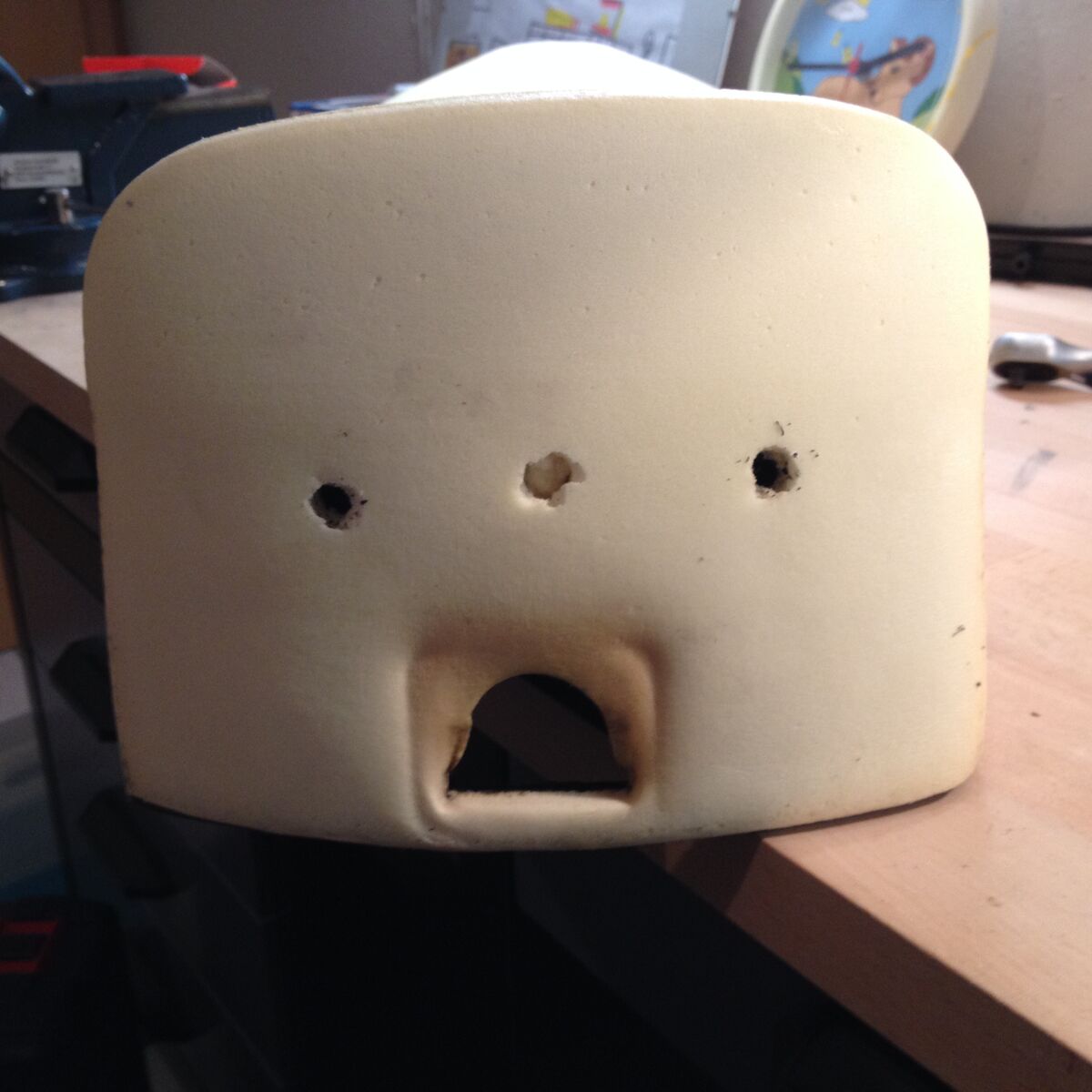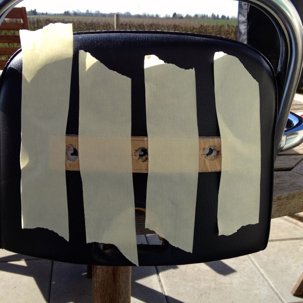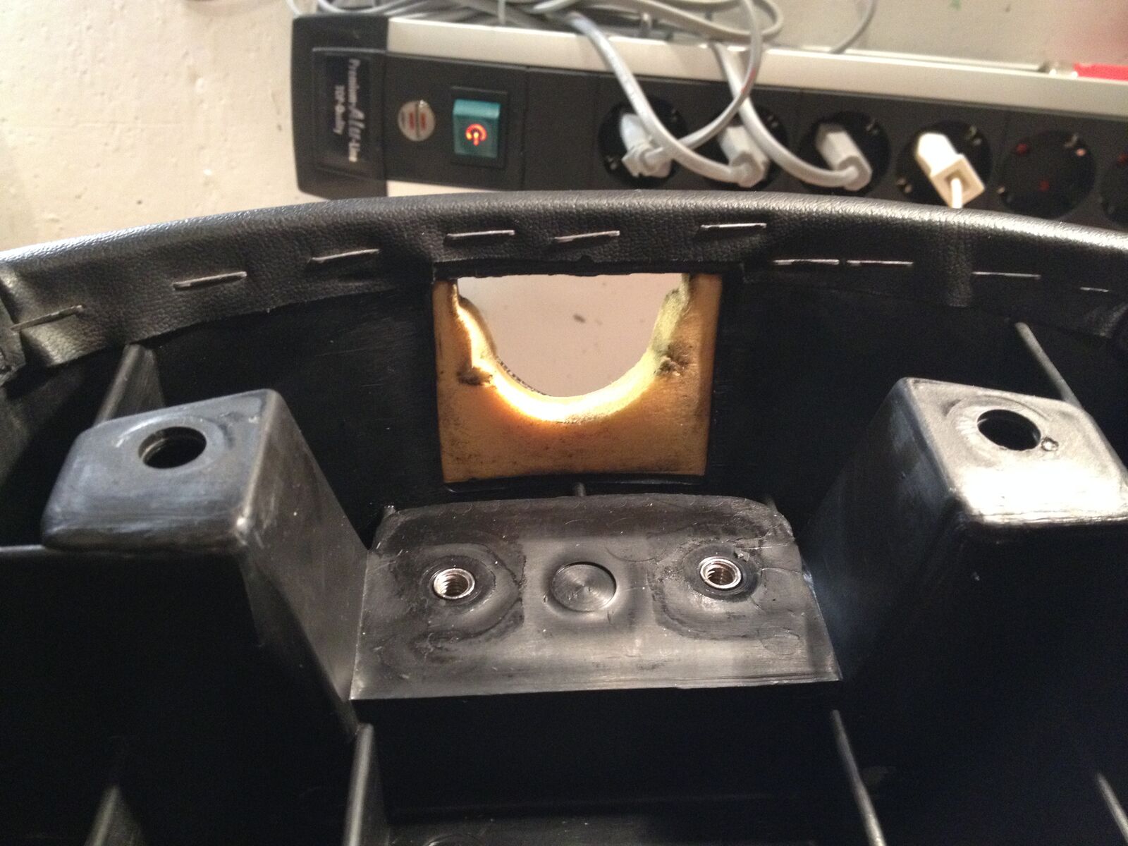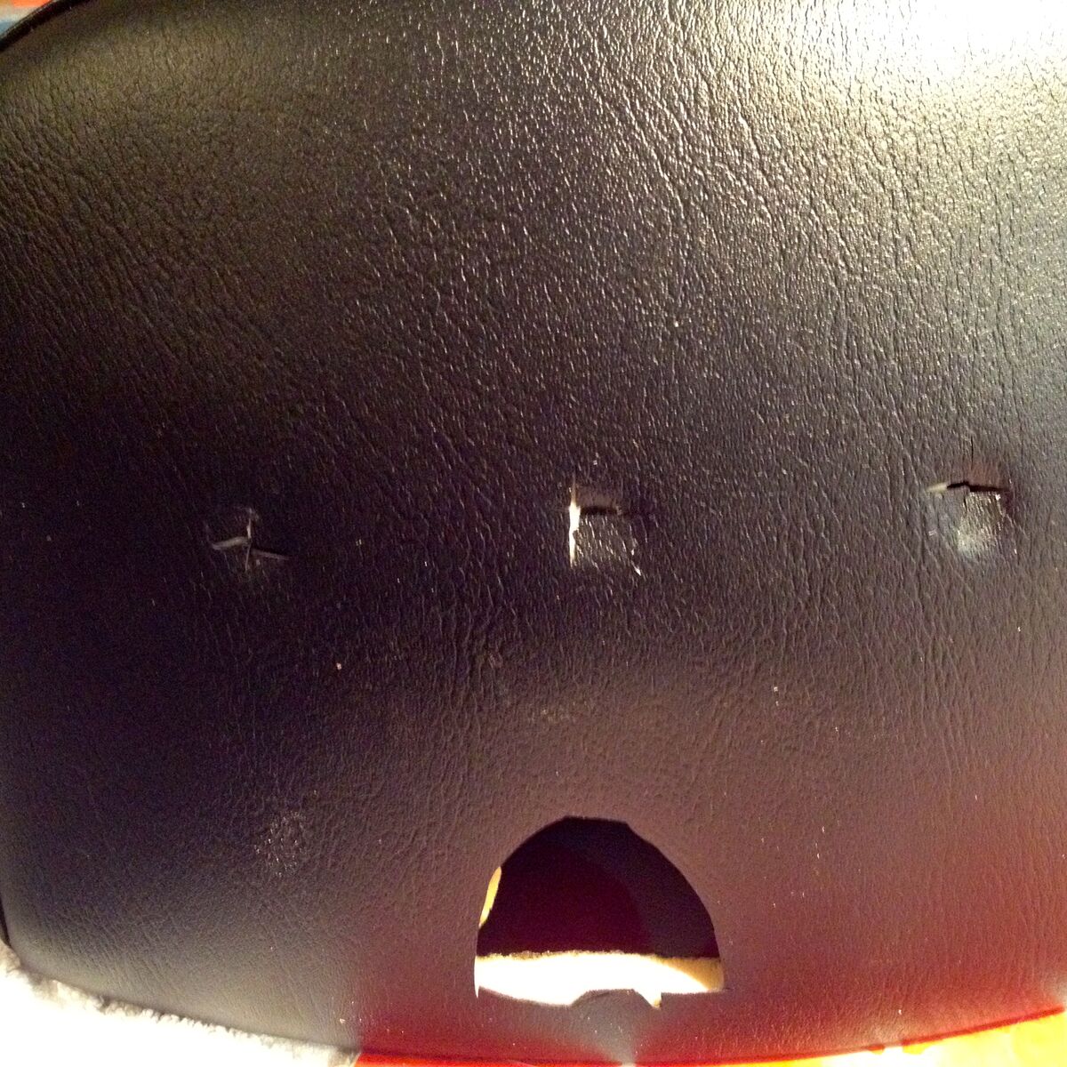 Durch den Sitzbankbezug die vorgebohrten Löcher im Schaumstoff ertasten und mit Skalpell oder Teppichmesser Bezug kreuzweise einschneiden, anschließend die Höcker des Schildhalters durch diese Löcher drücken und von hinten in der o.g. Weise anschrauben. Schloss montieren, Sitzbank am Roller anbringen, Probesitzen und freuen.Nach dem Bohren, mit eingelegtem Bit: