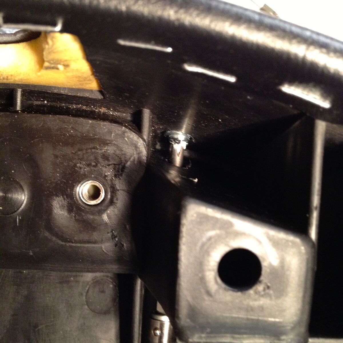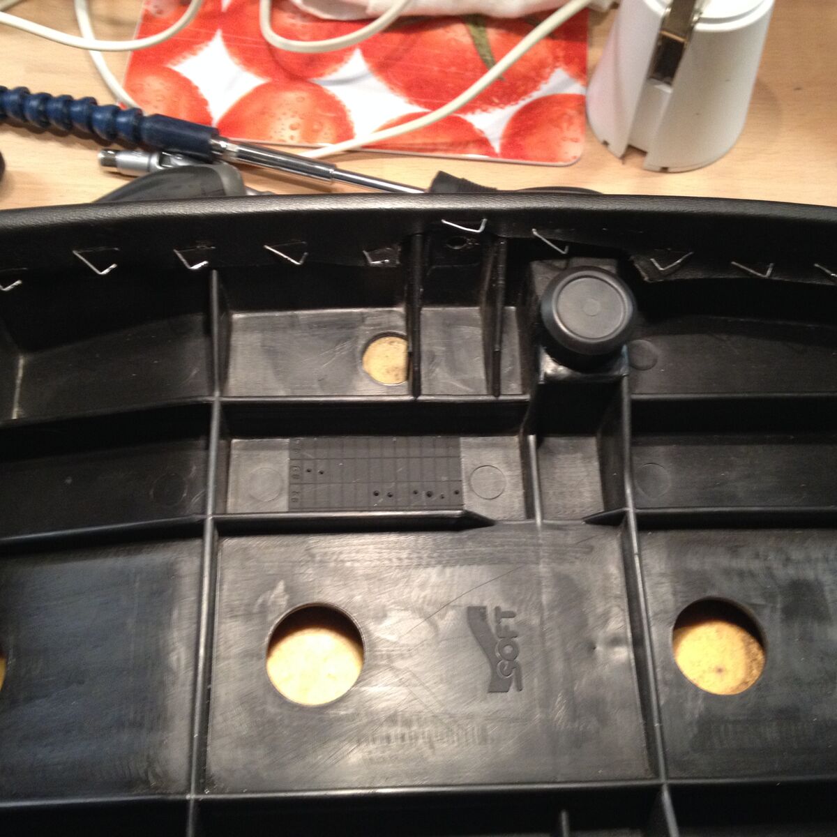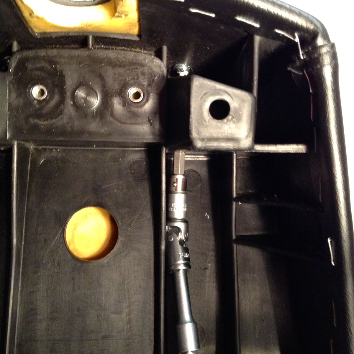 Jetzt gilt es ein weiteres Problem zu lösen: Dadurch das die nun entstandenen Löcher sehr nahe am Plastikboden waren und das Sitzbanklplastik auch noch eine schiefe Ebene in diesem Bereich aufweißt, kann man nicht mit einem geraden Schraubenzieher arbeiten. Man muß jetzt quasi ums Eck Schrauben. Hierfür habe ich mir mit einem flexiblem Bithalter beholfen, darauf ein langes Kreuzschlitzbit, darauf die Schraube und langsam durchs Loch balanciert und den Plastikhalter angeschraubt. Habe das zunächst am noch montierten alten Sitzbankbezug so ausprobiert. Als das gelang, Plastikhalter wieder abmontiert und weiter wie folgt.Alten Bezug entfernen: