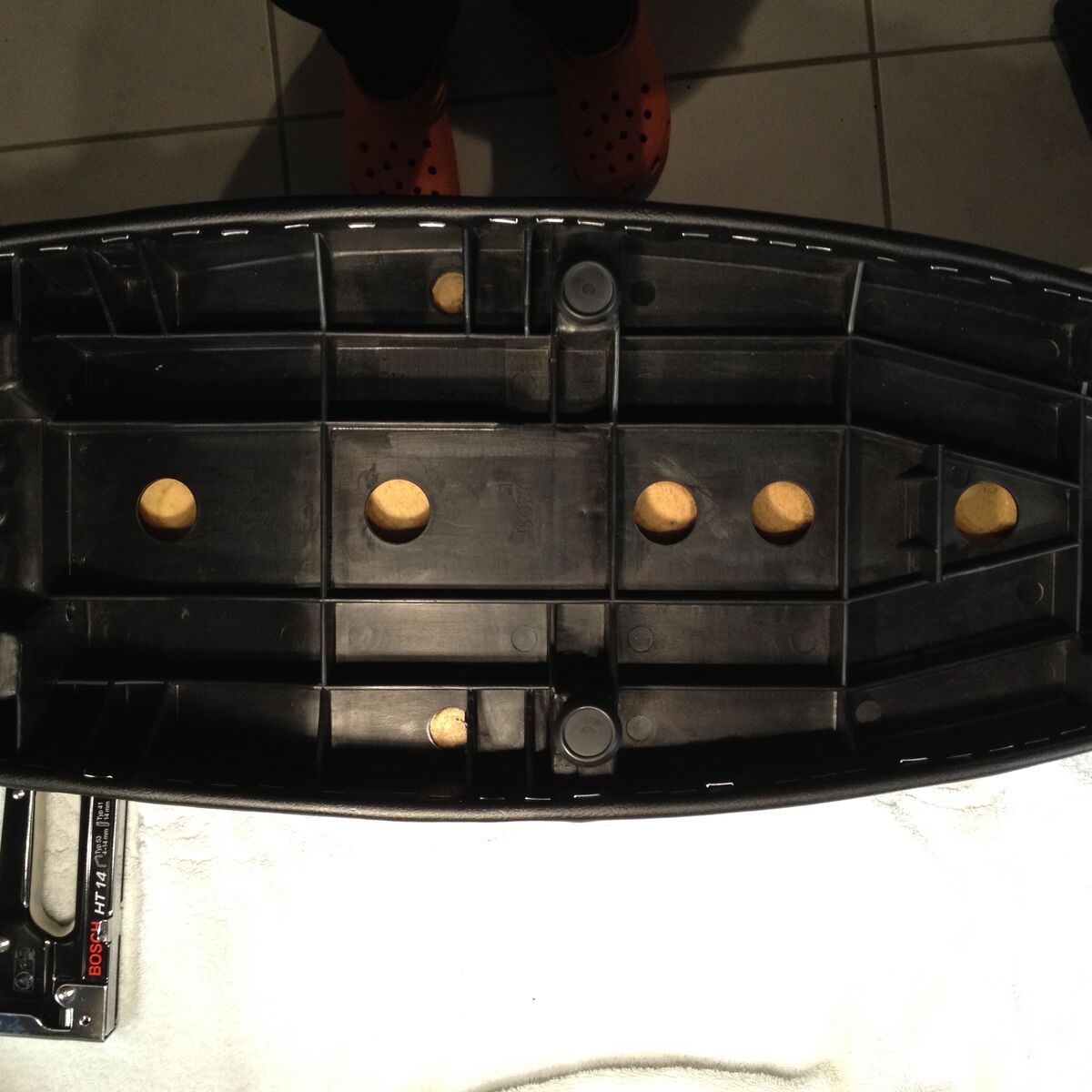 Sitzbankbezug für PX Lusso bestellt (Dieffe). Aus Karton eine Bohrschablone gebastelt und mit montiertem alten Sitzbezug die Löcher für den Halter vorgebohrt. Wichtig hierbei ist, dass man nur den Bezug und den Schaumstoff, mit einem Bohrer der den Außendurchmesser der Höcker hat (10mm), anbohrt, keinesfalls die Rückwand damit durchbohren, denn daran stützen sich die Höcker dann später ab. Jetzt braucht man noch Löcher für die Schrauben. Hierzu mit einem 8mm Bohrer durch die vorgebohrten li und re Löcher (Mitte bleibt unbelegt!) durch die Sitzbankrückwand und die 2 Plastik-"Türme" auf denen der Schloßträger der Sitzbank und die 2 Gummipuffer angebracht sind bohren.