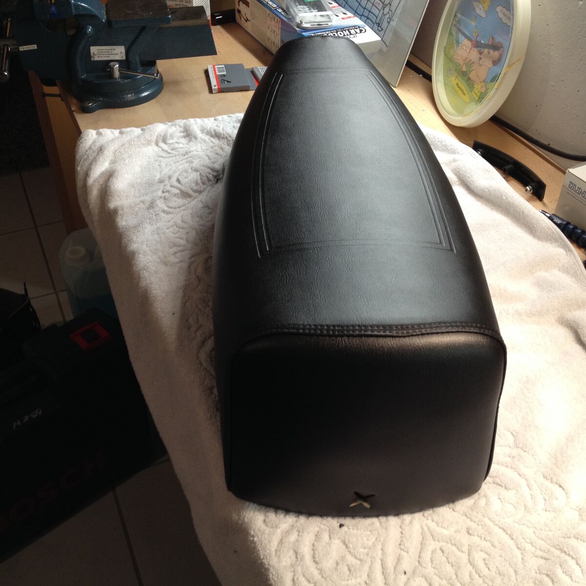 Wichtig ist, da der neue Bezug sehr stramm sitzt, dass man gleich beim Überziehen schaut, das die Sitzbank mittig in dem Bezug zu liegen kommt, späteres verschieben ist nicht möglich. Also versuchen das ganze gleich mittig aufzuziehen, dann immer wieder Sitzbank umdrehen und schauen ob die Nähte und Verzierungen der Sitzfläche gerade laufen und die Abstände passen. Wenn nein, Sitzbankbezug komplett entfernen und erneut anlegen. Wenn alles passt, Sitzbank mit einem Heißluftföhn leicht anwärmen, dann Sitzbank umdrehen und leichten Druck auf das Sitzbankgestell ausüben, gleichzeitig am Bezug ziehen, über den Rand umklappen und mit Heftklammer befestigen. Ich habe hier am hinteren Teil angefangen, da hier ein Loch im Sitzbankbezug für das Sitzbankschloß vorhanden ist und man dieses dann gut an dem Loch des Sitzbankunterteils für das Schloss ausrichten kann. Dann nach selben vorgehen ein Klammer vorne an der Sitzbank setzen, danach jeweils re und li an den Seiten. Wenn jetzt noch alles gerade ist hat man schon halb gewonnen. Ich bin dann so vorgegangen, das ich jede weitere Klammer immer immer auf halbem Abstand gesetzt habe und zwar abwechselnd re und li, vorne und hinten. Dazwischen immer Kontrolle ob das Muster und die Nähte noch gerade verlaufen und ggf Klammern entfernen und korrigieren. Bezug nochmals anwärmen und leicht anmodelieren. Sitzbank über Nacht bei Zimmertemperatur ruhen lassen.Anbringen des Plastikhalters für das Piaggio-Schild (wird morgen erledigt, Bilder folgen)