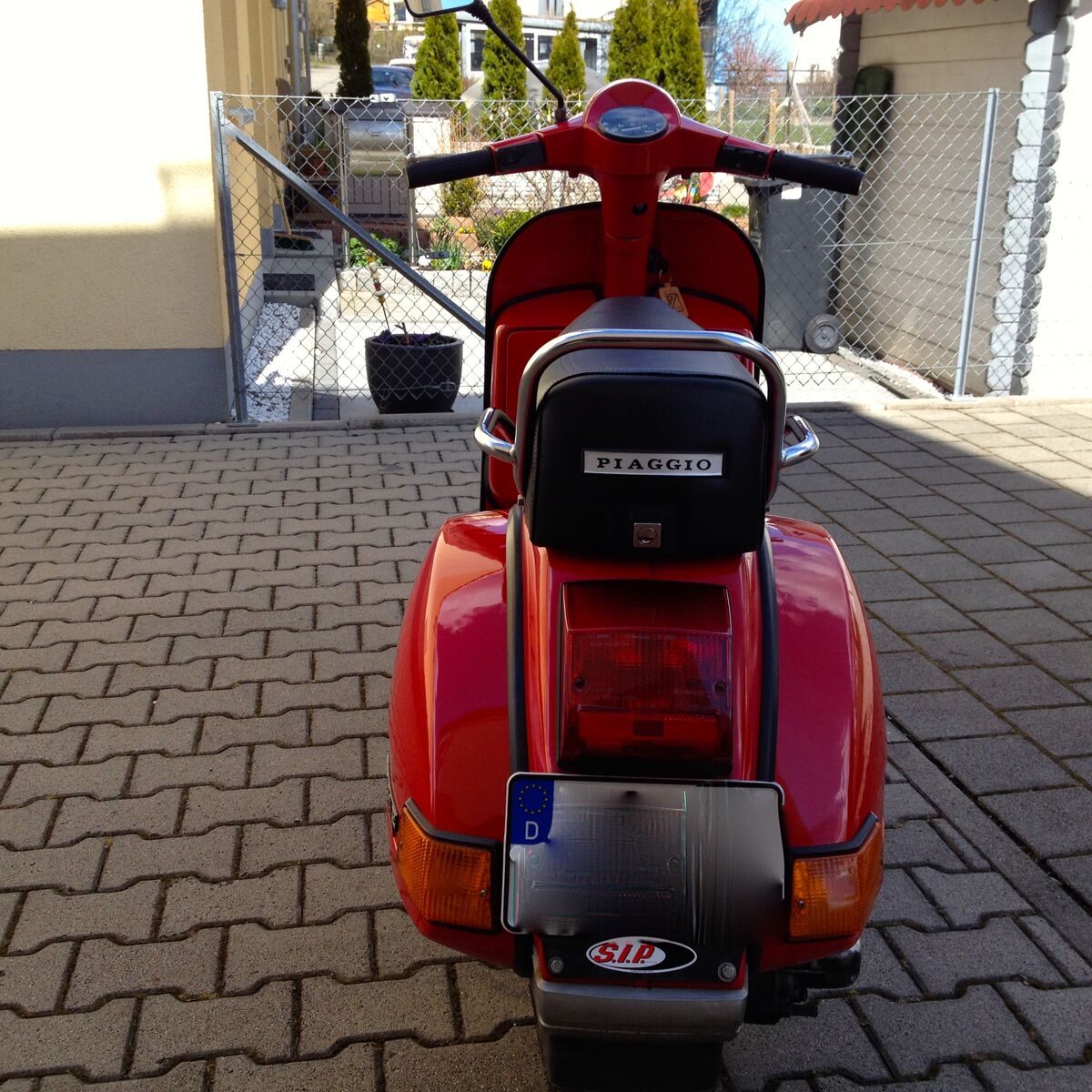 ich habe vor beinahe 1 Jahr eine Vespa PX 80e Lusso gekauft, mich seitdem hier im Forum rumgetrieben und auch schon schon ein paar sehr gute Ratschläge bekommen. Eigentlich wollte ich im Winter 2014/2015 eine Komplettrestauration mit meinem Sohn durchführen, da die Vespa aber so gut läuft, trocken ist und noch O-Lack hat habe ich mich entschlossen derzeit nur das wichtigste zu machen und die Sache auf nächsten Winter zu verschieben. Ziel ist eine möglichst originalgetreue Restauration, so als wäre sie gerade vom Band gelaufen. Teile welche noch in Ordnung sind werden aufbereitet, Verschleißteile originalgetreu ersetzt. Ich habe mir deshalb einen Vespa-Prospekt von 1993 besorgt um den Originalzustand abgucken zu können.