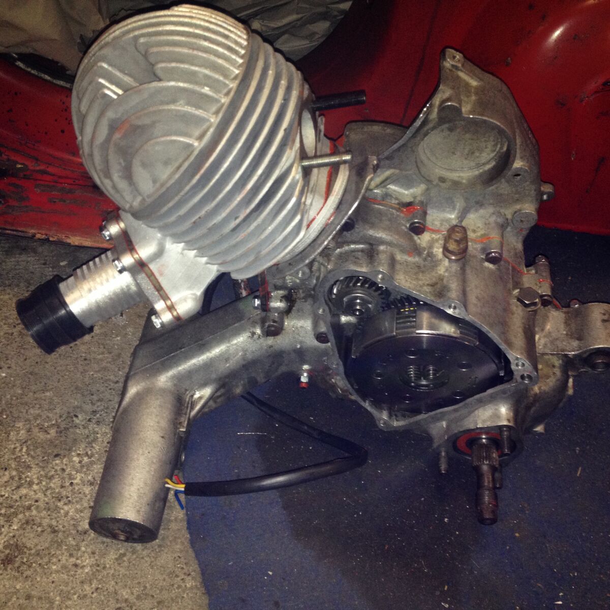 Der Motor hat einiges an Nerven gekostet! Hier mal was nicht funktioniert, dort noch mal ne Schaltklaue 3 mal auseinander nehmen und wieder zusammen bauen müssen. Wieso? So genau hab ich das auch nie verstanden, aber irgendwann hats dann funktioniert. Bei der Kupplung hat sich das dann alles noch mal in die Länge gezogen, aber dies einfach nur, weil mir ein nicht unerheblich wichtiges Teil einfach gefehlt hat. Da kann der Hersteller aber nix für. Im Gegenteil, er hat mich Porno Supportet!!(Dickes Danke an dieser Stelle!) Und schlussendlich hab ich ihn dann auch zusammen bekommen und konnte alles schon festschrauben und anschließend nach Hause fahren, mit dem Rad.....(noch) nicht mit dem Ri Ra Roller!Dann ging es darum den Motor in die Karosse zu stecken, Reifen druff, Versager druff und ICH WILL DAS DING HÖREN!
