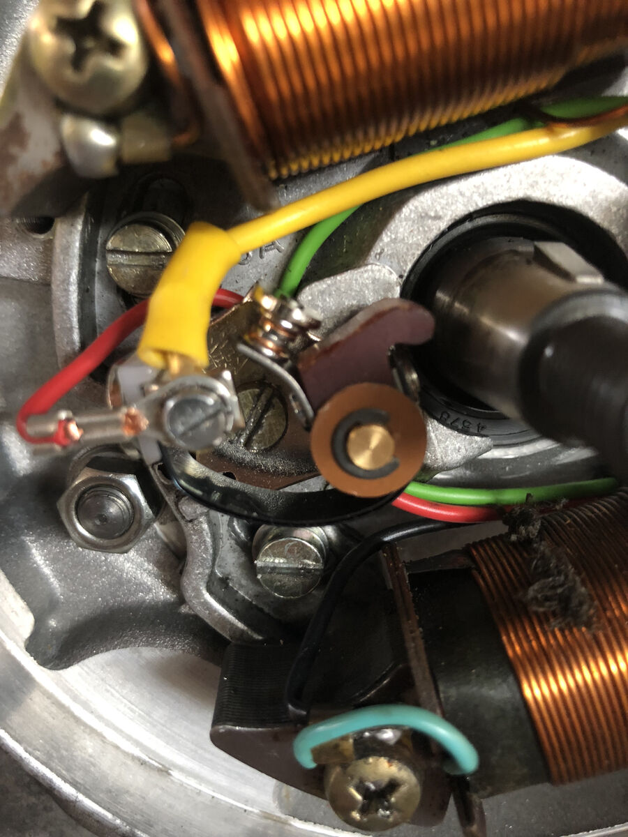 - das blaue Massekabel der Zündspeisespule, welches an die linke Befestigungsschraube der Spule geschraubt ist.- die Masse des Kondensatorgehäuses gegen die Grundplatte.