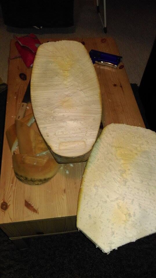 Ich hab den alten Schaumgummi, ringsum angezeichnet und mit einem langen Messer (in meinem Fall ein Brotmesser) zusammengeschnitten.
