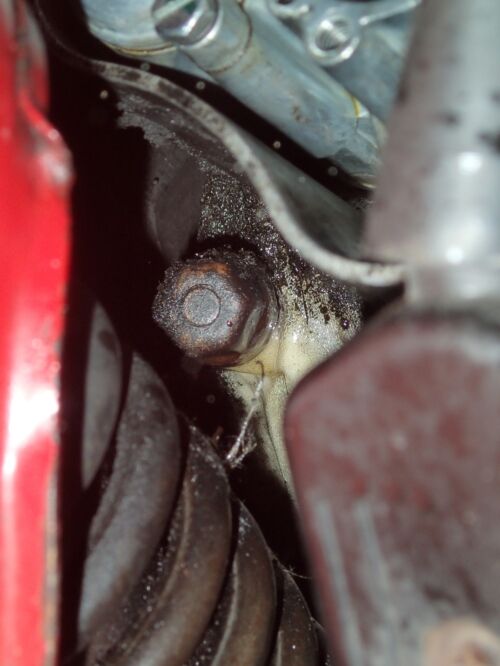 Das ist ja keine Schraube sondern ein Stehbolzen. Der sieht allerdings ziemlich vergammelt und rostig aus. Ich habe ihn jetzt mal mit Brunox eingeweicht. Mal sehen, ob sich die Häflten danach bewegen. Auf jeden Fall gehen sie oben leicht auseinander und unten sind sie fest. Wenn alles nicht hilft, dann kommt der Schweißbrenner zum Einsatz. Hitze hat bis jetzt immer geholfen.