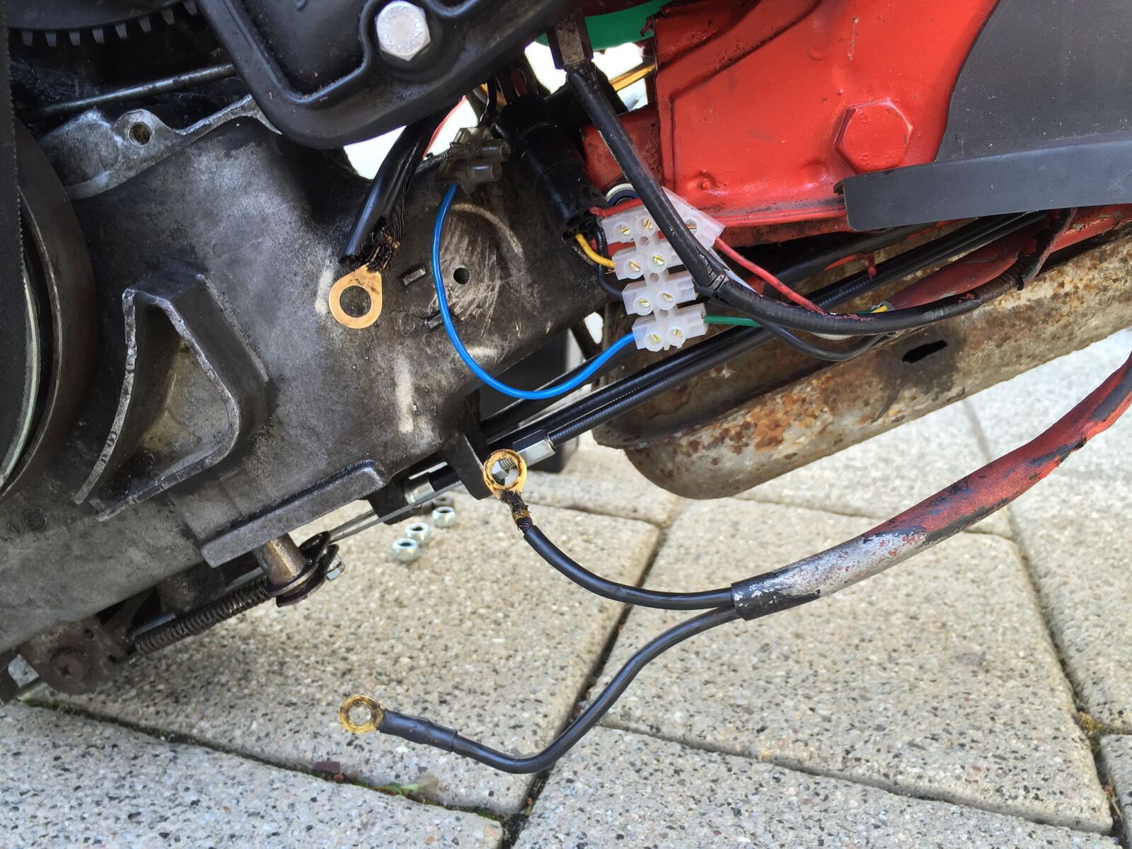 mein 12-Jährger Sohn und ich haben uns auf die o.a. Vespa gestürzt. Wir haben sie zerlegt erworben um es als Projekt zusammen zu richten. Wir sind recht weit gekommen - es ist zusammen. Es läuft - der eStart geht, der Motor läuft und es fährt einigermaßen - Standgas hält er nicht aber ich denke da muss der Vergaser mal gescheit Ultraschall gereinigt werden. Das ist Mechanik und kein Thema. Ich komme nur an einer Stelle nicht weiter - vielleicht kann einer der Experten helfen. Da der Vorbesitzer das Teil zerlegt hat - und leider sämtliche Leitungen, Züge und so weiter gekappt hat - weis ich nicht wie z.B. die Elektrik zusammen gehört! Wie gesagt es geht alles inkl. Hupe und Blinker - nur Licht und Instrumente gehen nicht. Ich vermute das es ein Masse Fehler ist da. Ich habe mal ein Bild angehängt wo ich hänge und den Fehler vermute.Frage: Wo gehört das Masse Kabel oben rechts hin (kommt direkt vom Starter)? Wo gehört dammittlere Massekabel hin (kommt von vorne) und wo gehört das untere Massekabel hin (kommt auch von vorne)?