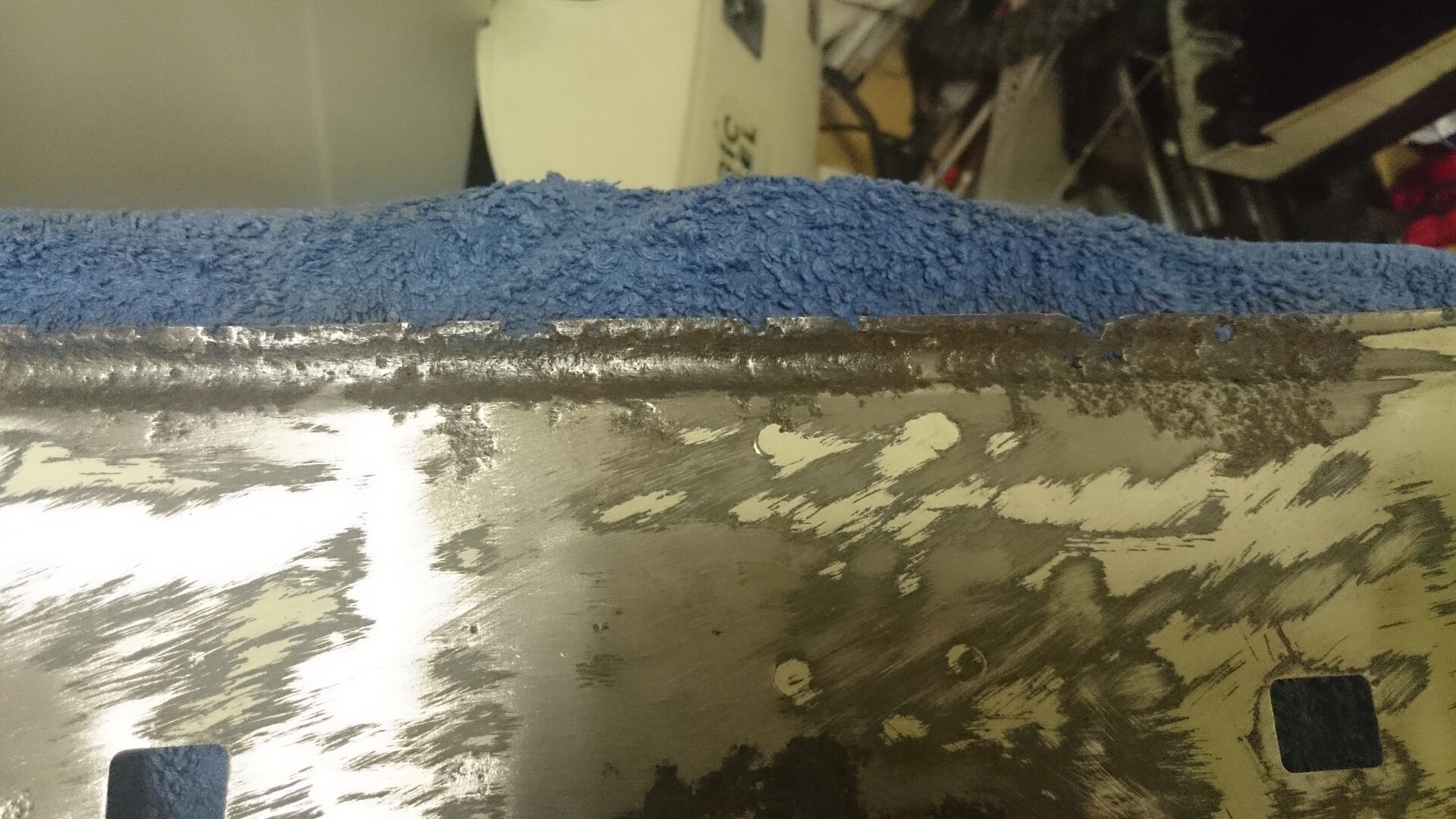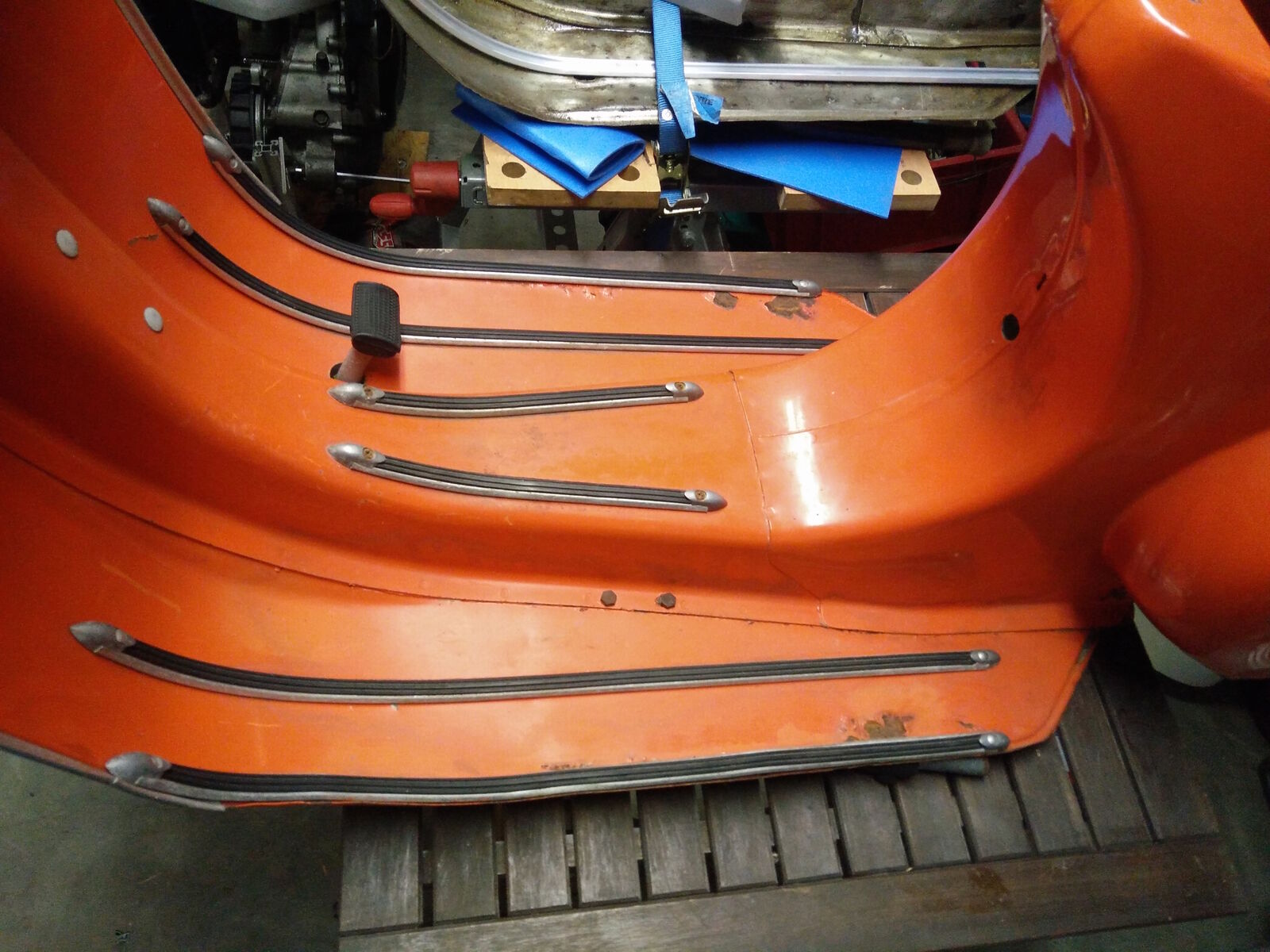 Ein paar Löcher, Problemzone die Endspitzen des Trittbretts hinten. Die eine Seite ist komplett weg, die andere fast. Was kann man da machen? Gleichmäßig abschneiden das beide Seiten gleich sind? Riffelblech drauf?