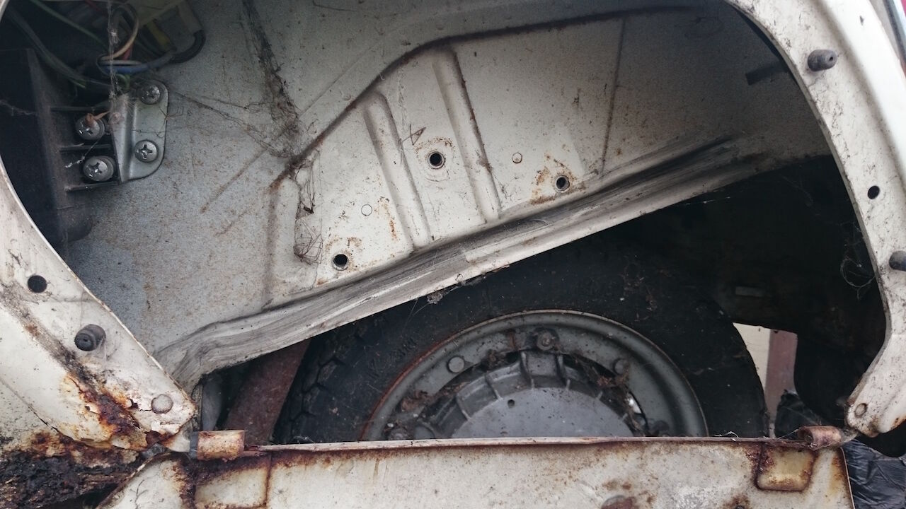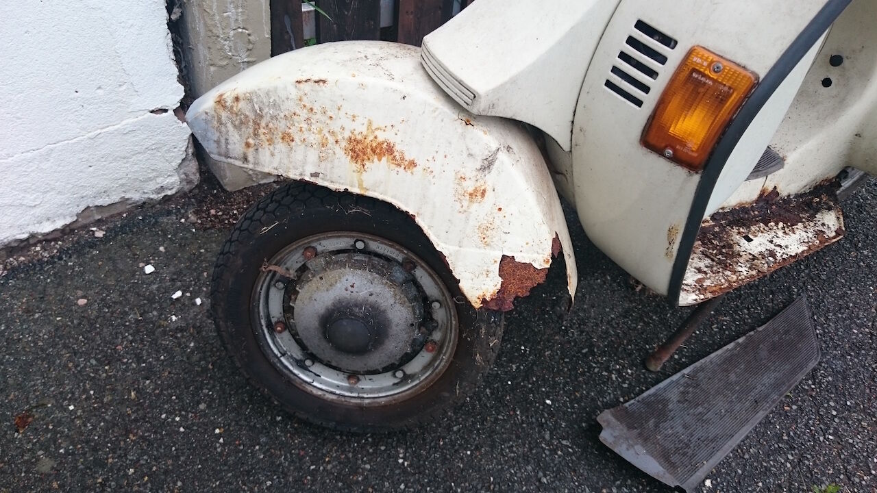 Bei der Gelegenheit habe ich Bilder gemacht um den Zustand zu dokumentieren. Die Vespa stand unter einen Vordach, das Vorderrad scheinbar weniger geschützt.