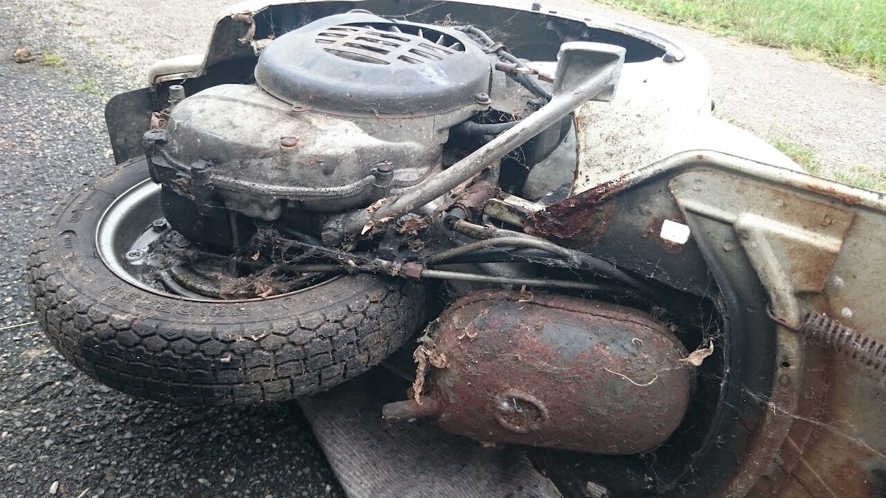 Das gröste Problem wird der Rost sein. Der Motor lief bis zum unterstellen, lässt sich leicht durchdrehen, hat gute Verdichtung. Es ist ein Polini 75ccm Zylinder verbaut, Vergaser ist ein SHB 16/15 mit 65er Hauptdüse und 42er Nebendüse. Den Rest erklären die Bilder.
