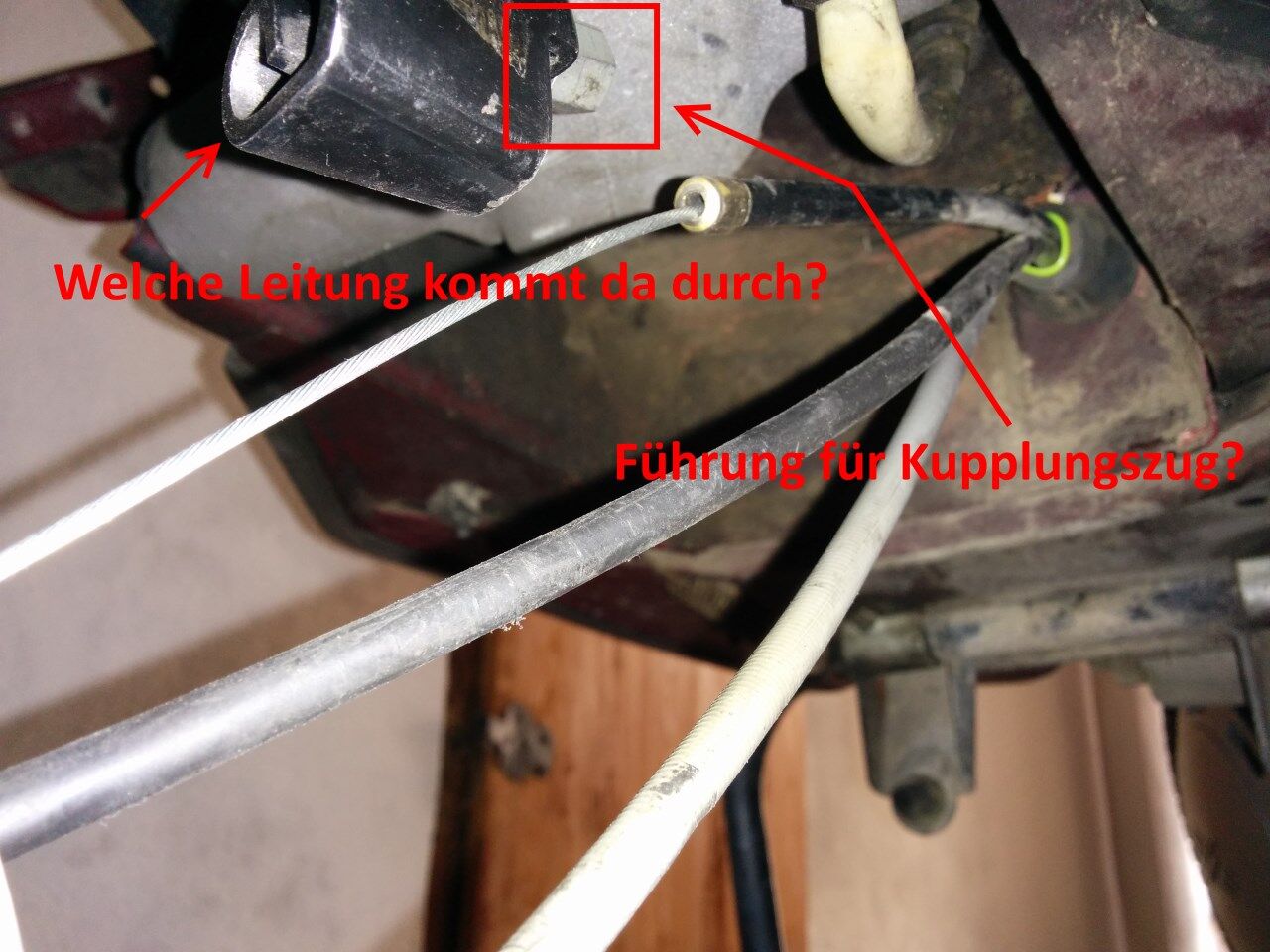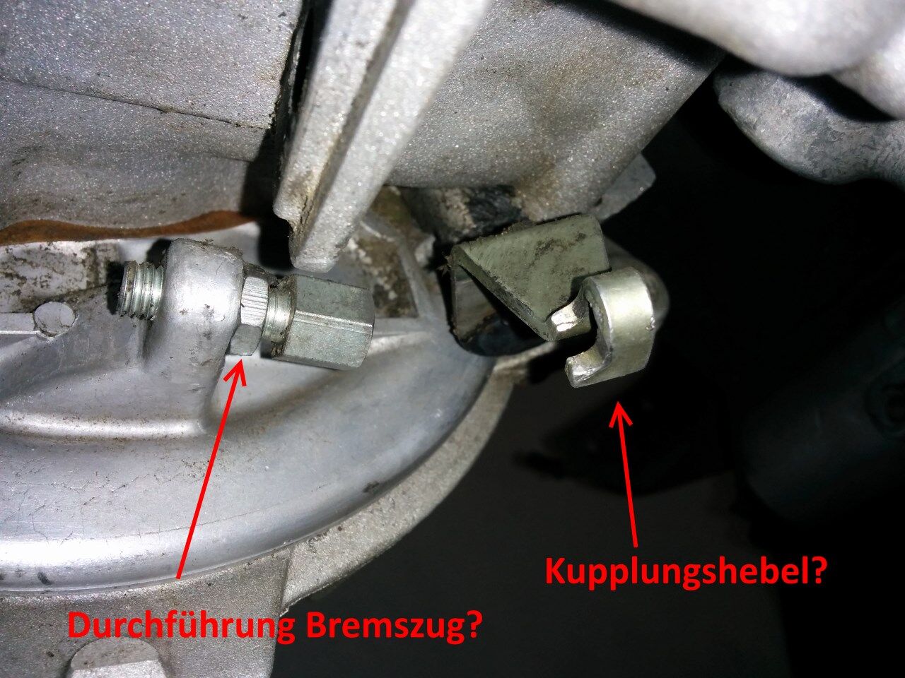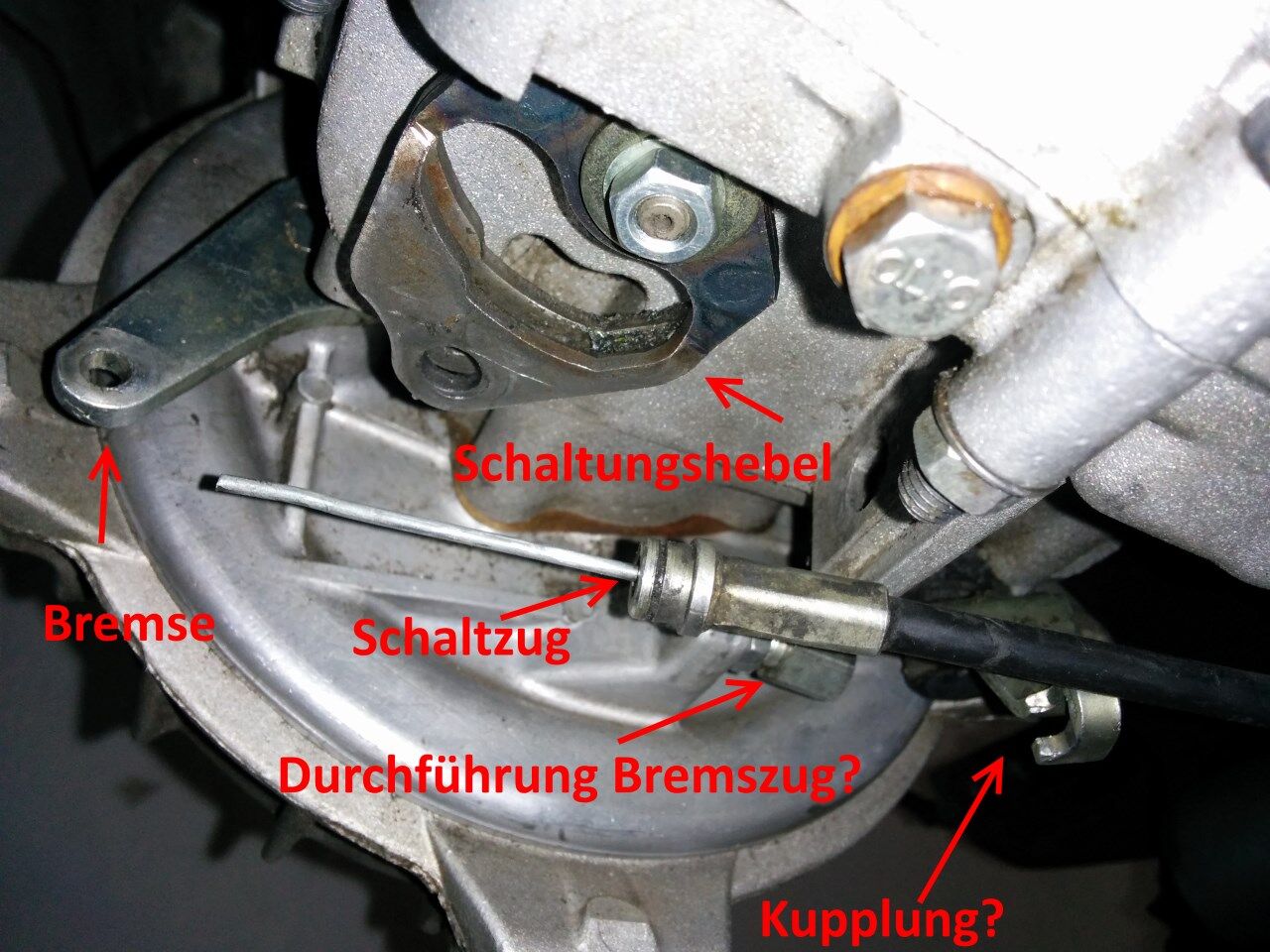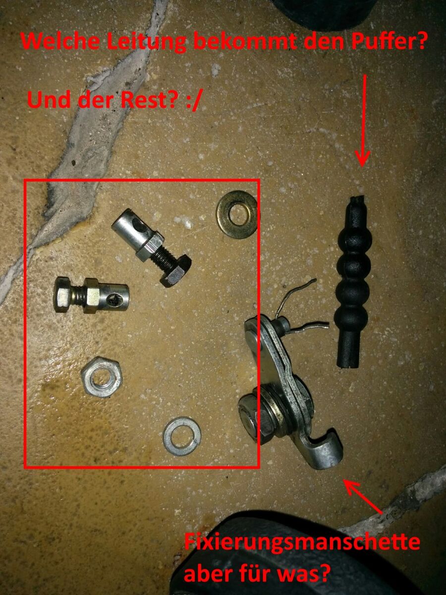 Habe drei Züge, die hinten raus kommen. Kupplung, Bremse und Schaltung. Eine große Schwarze Durchlauf Halterung, wo mindestens ein (oder zwei, oder drei ?) Zug durch soll. Dazu kommt noch eine Art Manschette zur Fixierung einer der drei Züge. Hier weis ich leider gar nicht mehr, welcher hierfür vorgesehen war.