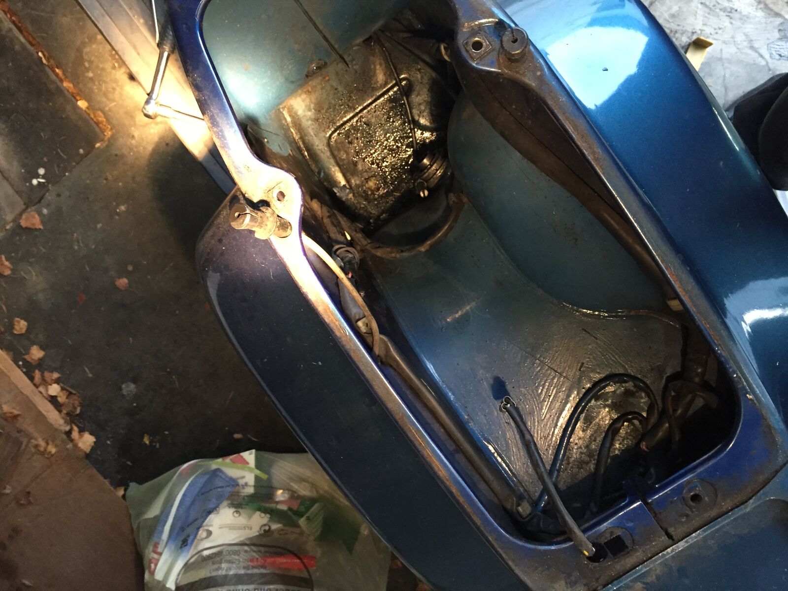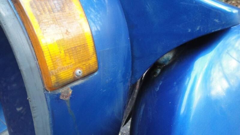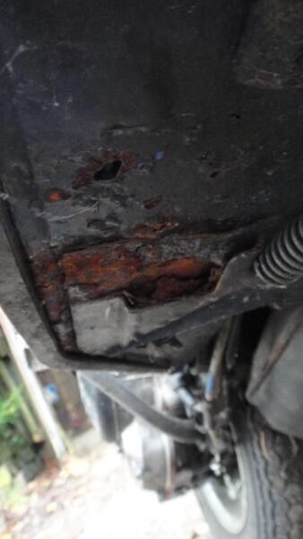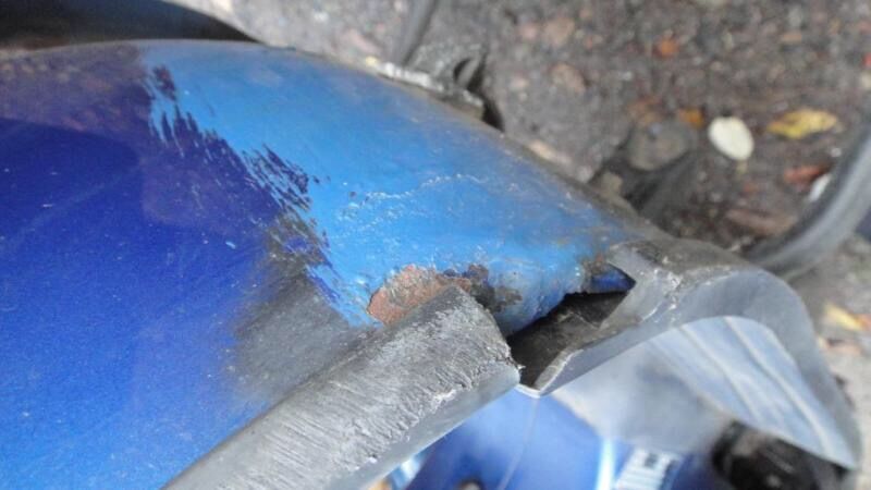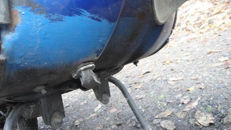 Einige Teile wohl noch im O-Lack…vorne/unten am Beinschild und unter den Trittmatten wurde mal nachgepinselt. Keine Welle hinterm Koti, jedoch Durchrostung am rechten Trittblech und leichte Rostansätze hinten rechts + vorne Blinker/Beinschild (siehe Fotos).