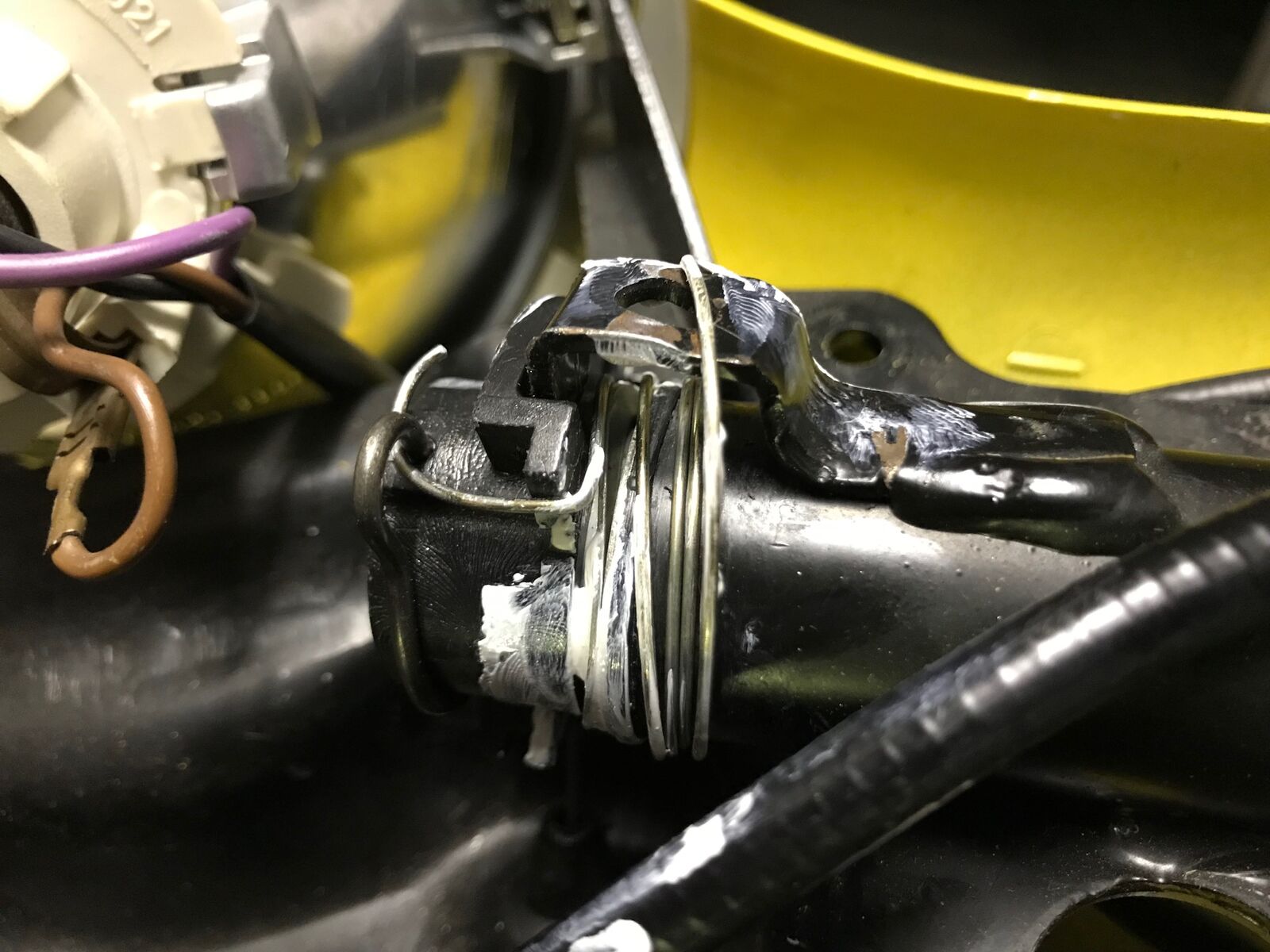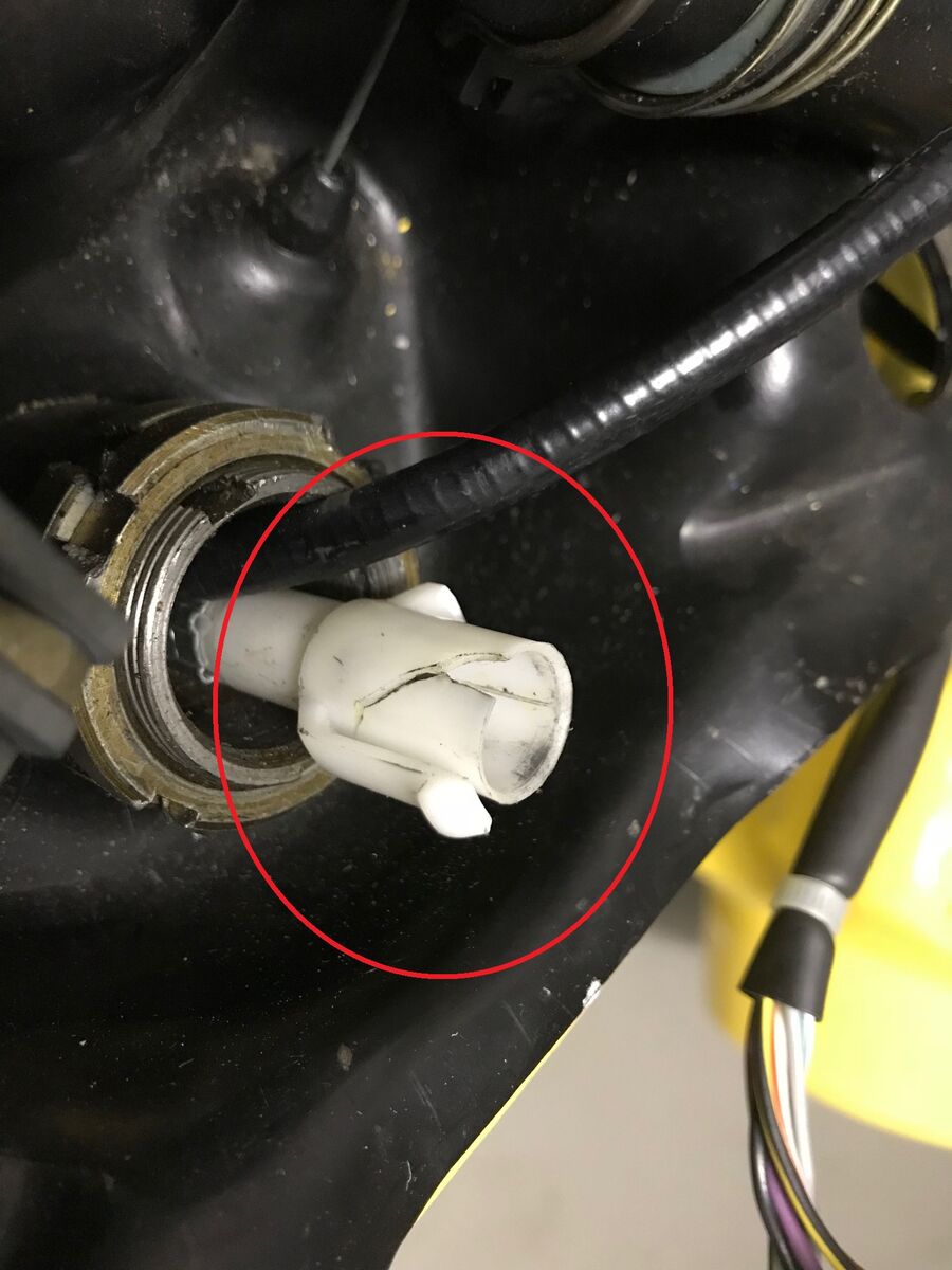 Beim Öffnen der Lenkerabdeckung ist mir noch ein weiteres Problem aufgefallen: Bei der Tachowelle ist am Ende eines der zwei Pins abgebrochen, s. Foto. Hättet ihr einen Tipp was ich da machen kann? Das beeinflusst doch erstmal nur den km Zähler oder?