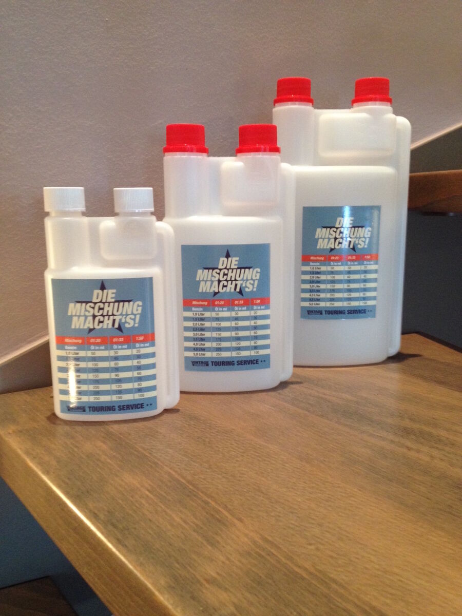 oder einfach hier kaufen :Dosierflaschen für Zweitaktöl in drei verschiedenen Größen mit Mischungsverhältnisaufkleber