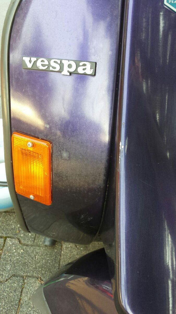 wie auf den Bildern zu sehen, ist der weiße Sitz meiner Vespa durch das Tragen von einer dunkelbraunen Lederhose aufgeraut und verfärbt. Aber auch andere Macken sind dabei.