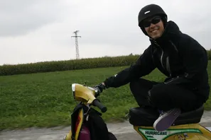 Guter Vespakollege der glaub nicht kapiert das man während der fahrt nicht im Schneidersitz Gummibärchen auf die anderen wirft....
