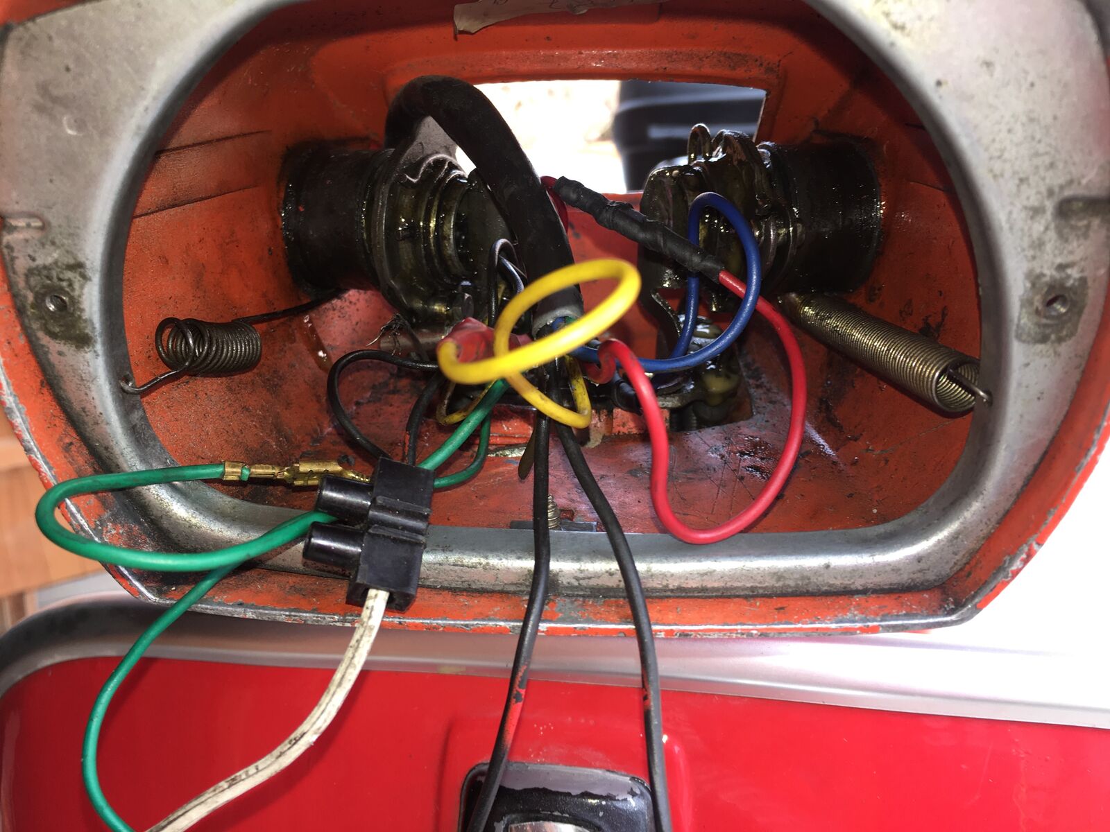 Das grüne vom Schalter kommend ist mit männlichen-Schuh auf weiblichen Schuh gesteckt... teilt sich dann als Y" einmal nach hinten und einmal auf die