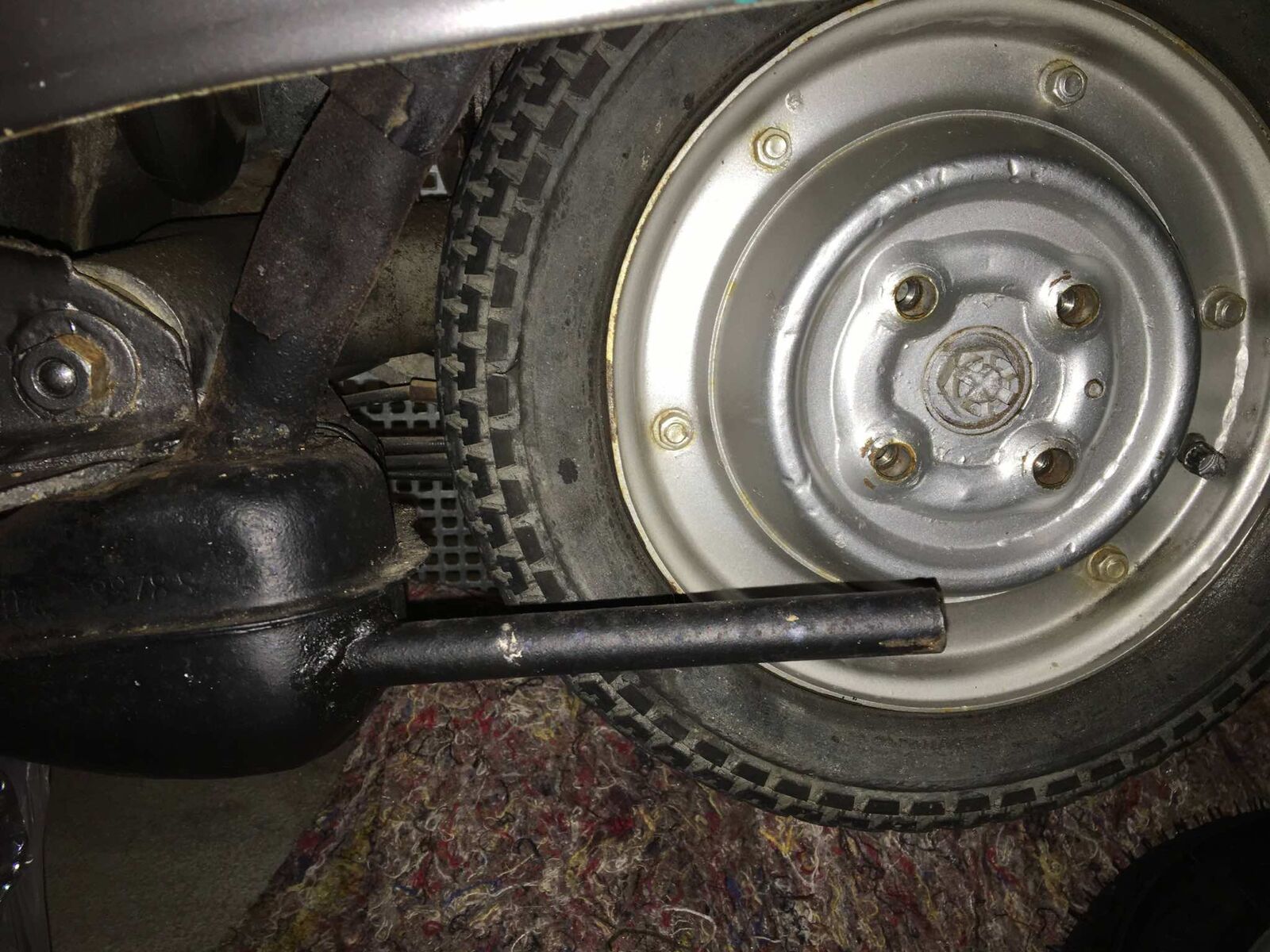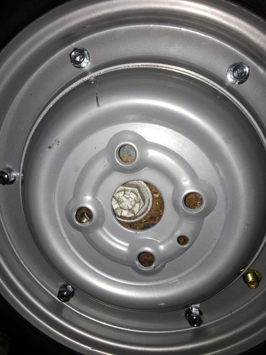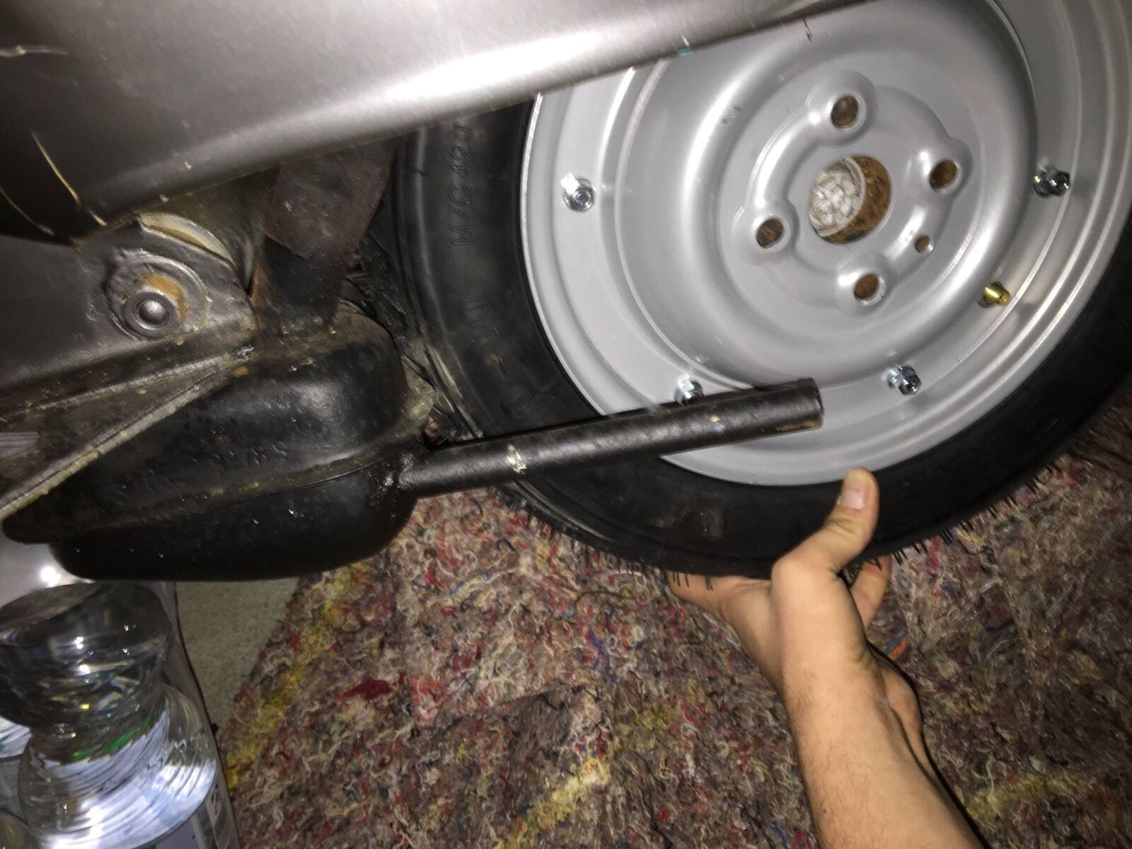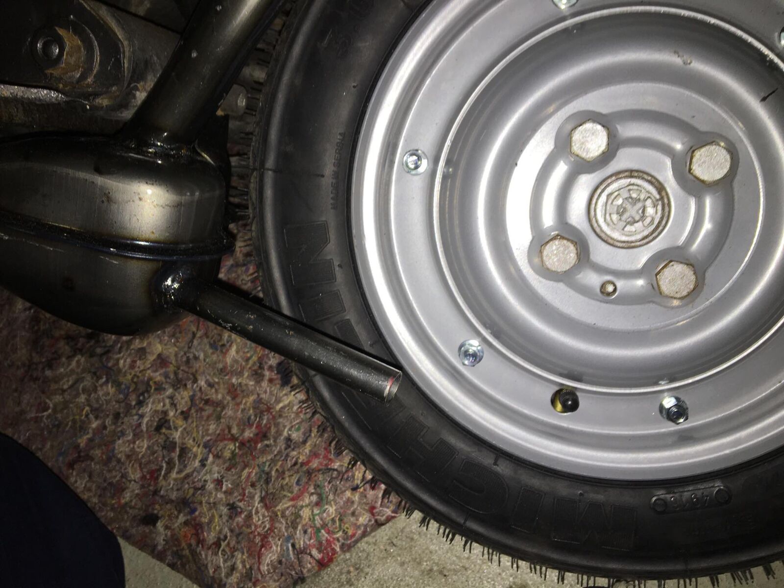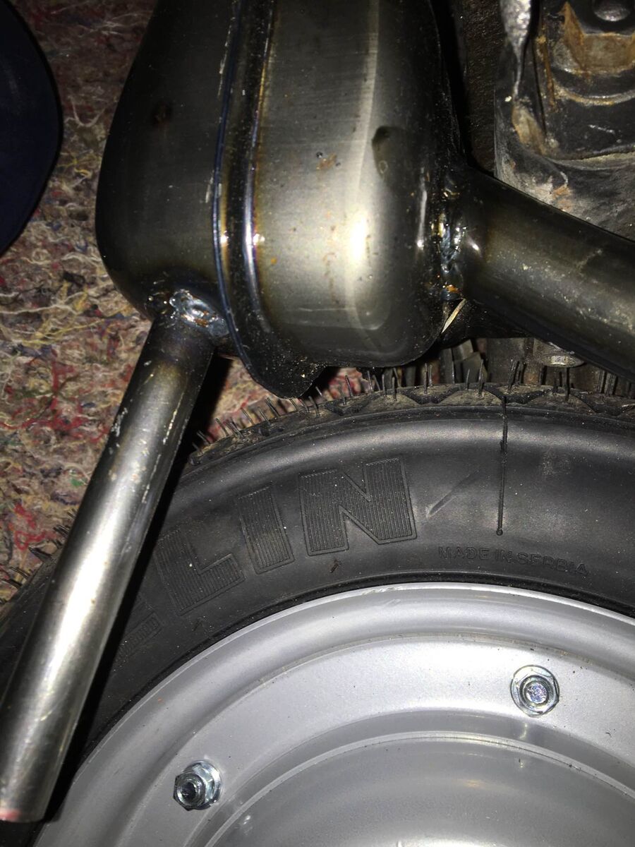 Geht doch auch nicht auf die Narbe der bremstrommel da der Auspuff stört. Ich bin auf Maximum mit dem reifen zum Auspuff komme garnicht mit dem Loch auf die Narbe.