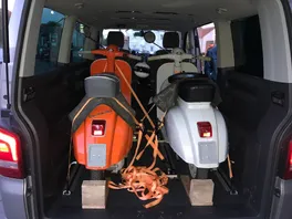 Dann Fahrt aufs Land zu einem Autohändler; der Seniorchef sammelt und handelt als Hobby mit alten Rollern. Netter Kontakt. Bekommt die Roller angeblich von einem ihm gut bekannten Restaurator in Südtirol. Beide Roller mit §21 und italienischen Papieren.