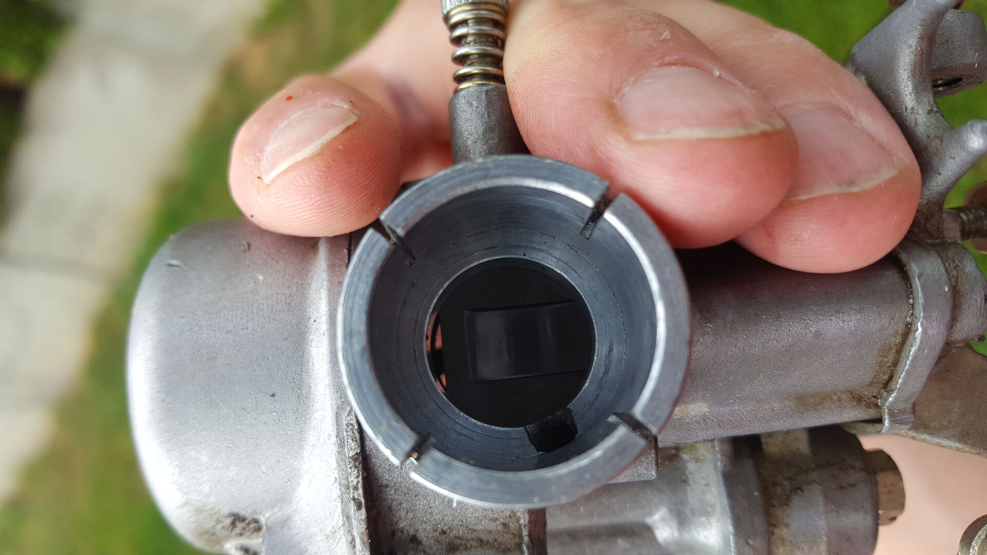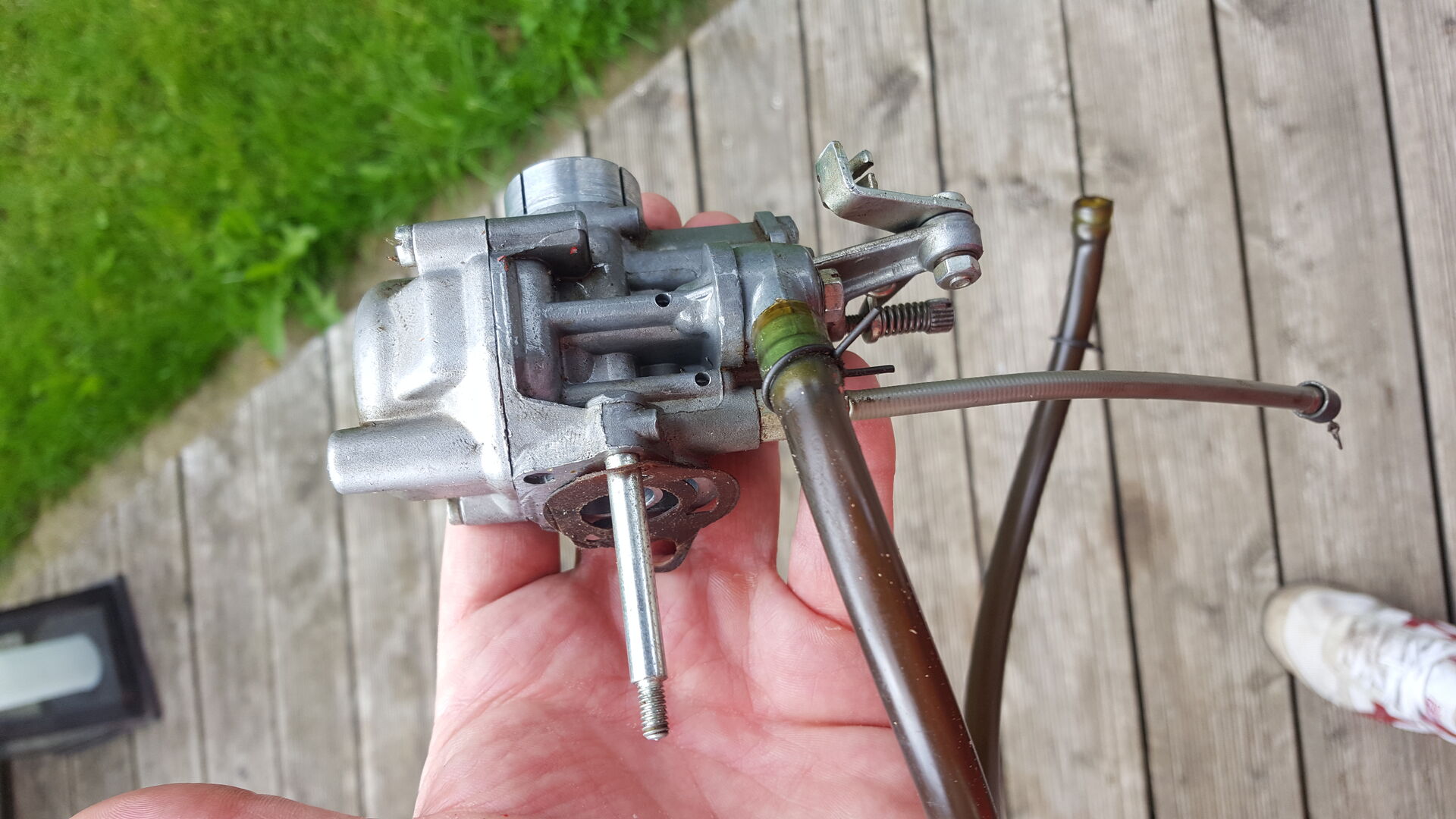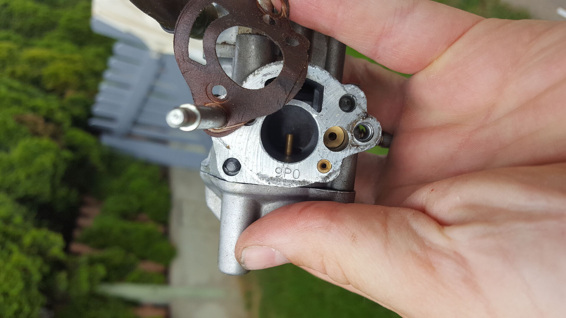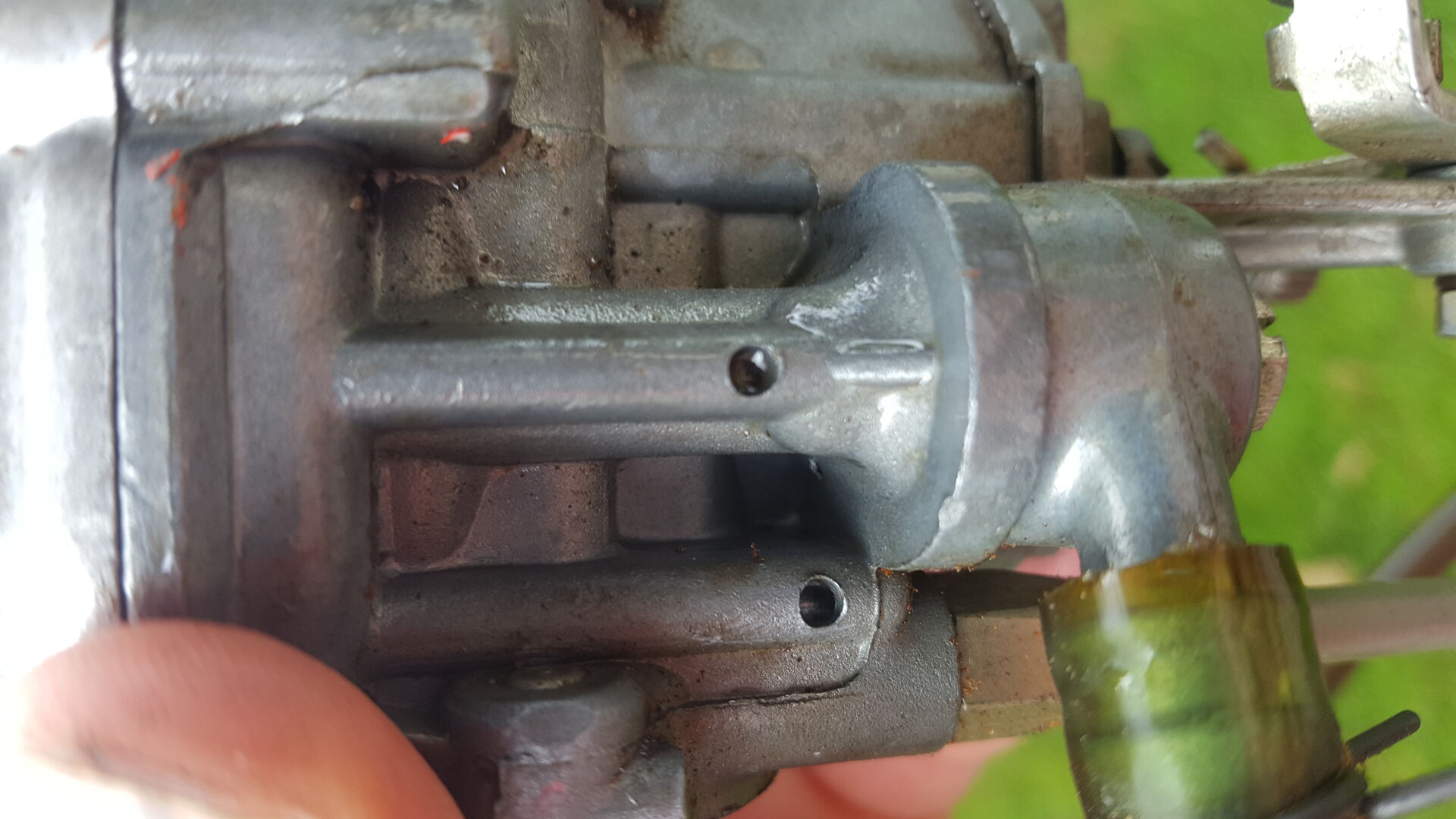 Zweitens: ist es normal, dass wie auf dem Bild schlecht zu erkennen ist, ein benzingemisvh aus diesem kleinen Loch an der Seite läuft wenn ich den vergaser auf den Kopf stelle?
