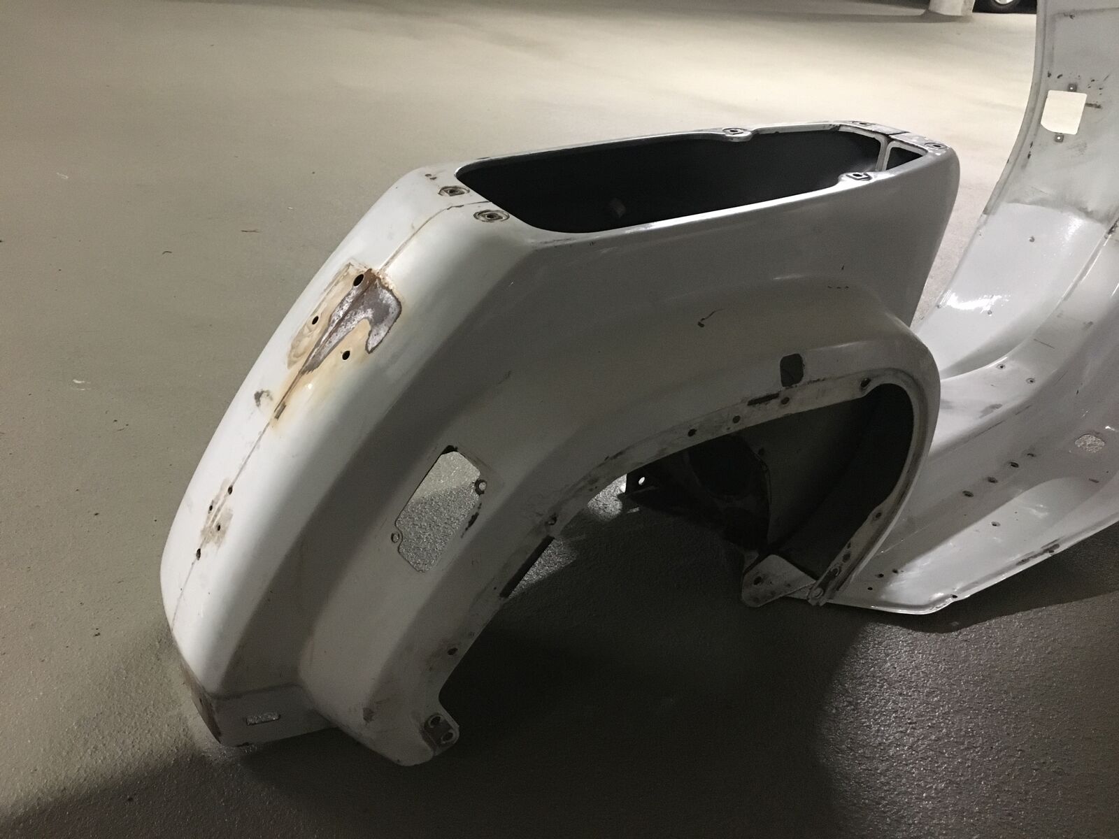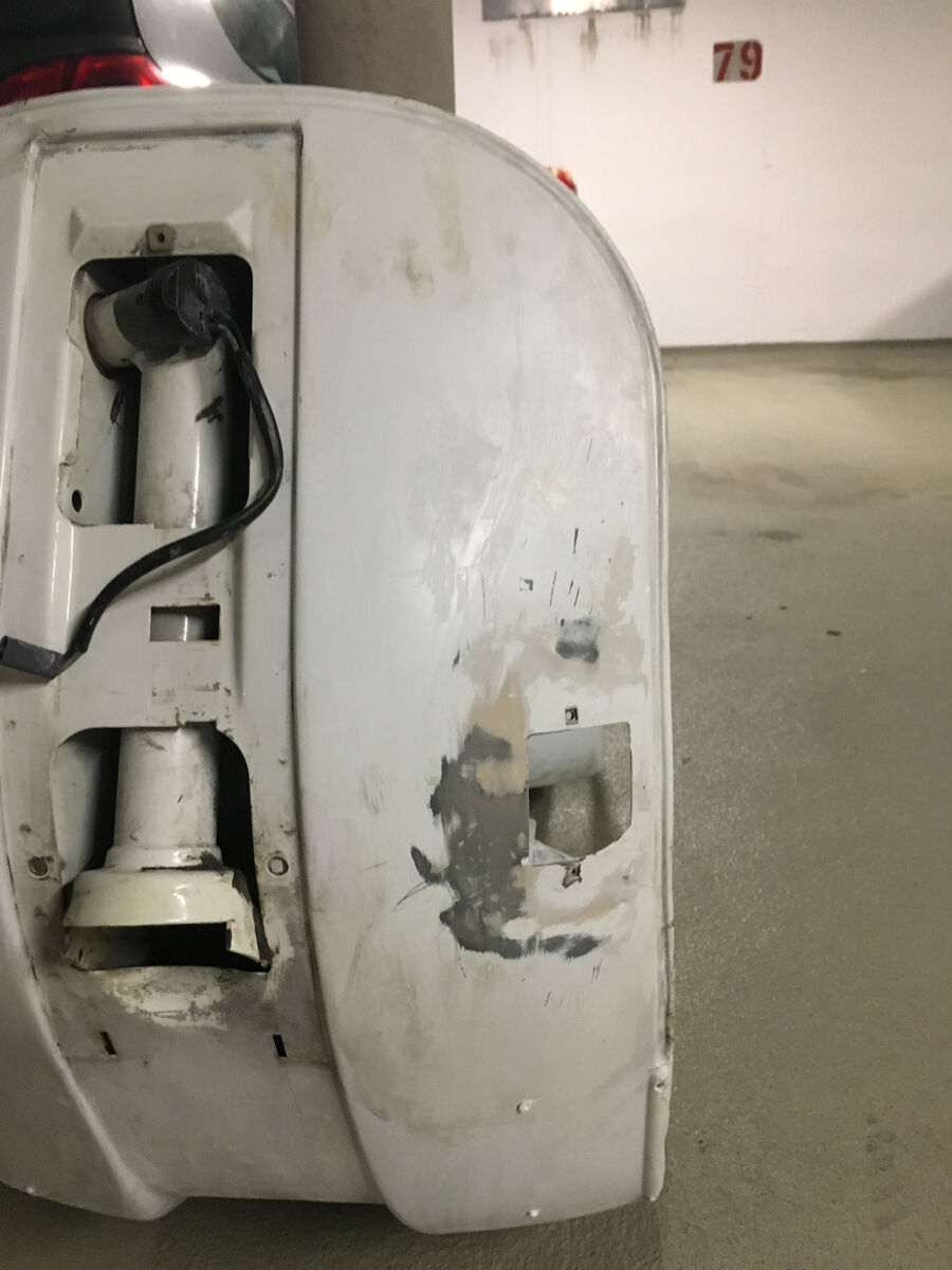 Hier ist doch noch das ein oder andere Foto, was ich gefunden habe. Habe mal die Blinker und das Rücklicht abgenommen. Darunter kam ein „dreckiges“ Weiß zum vorschein. Sieht man auch ganz gut im Übergang zum Radkasten. Außerdem bröckelt es an manchen Stelle leicht ab.