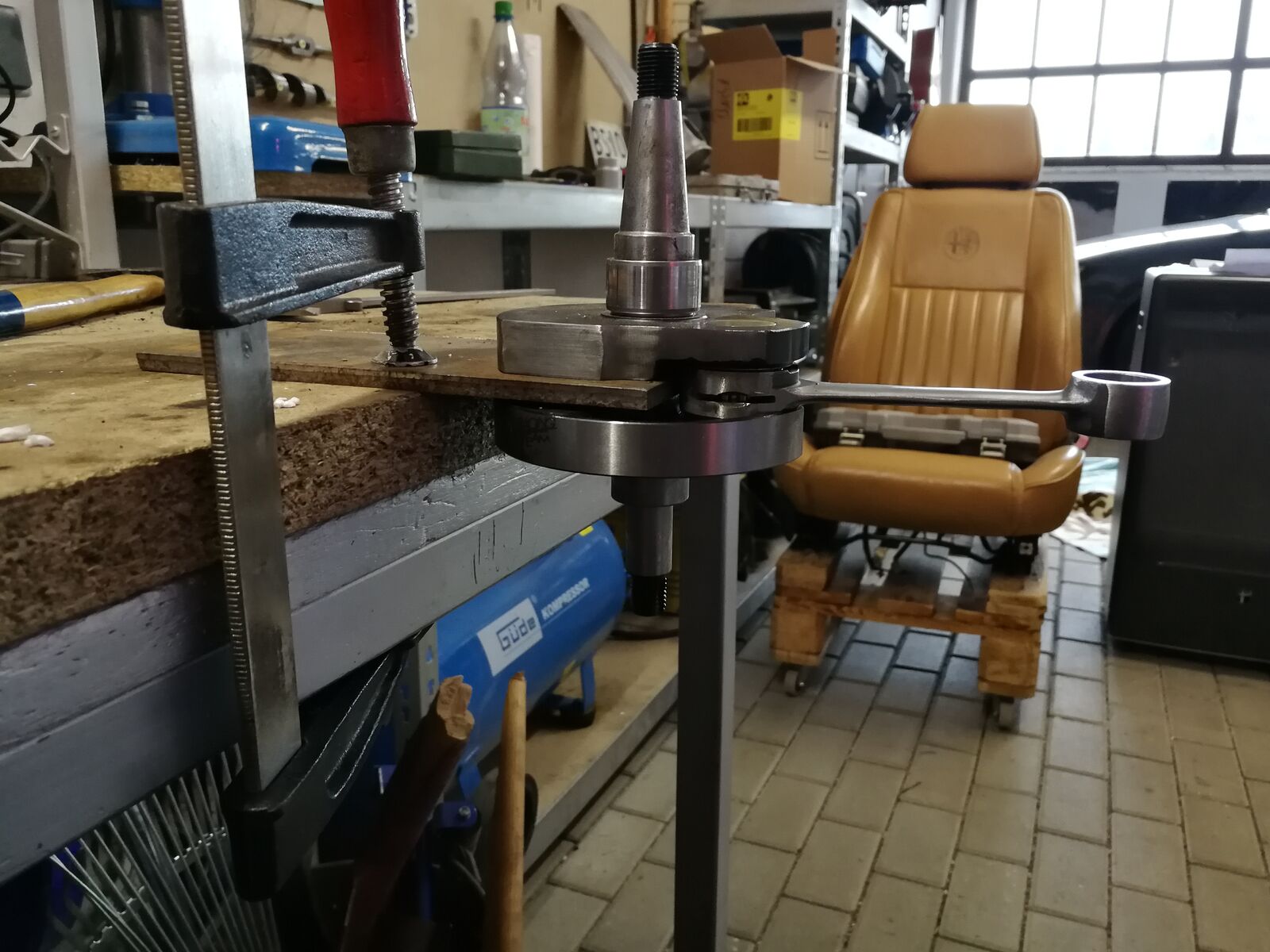 Dann wollte Ich den Lagerring auf die Kurbelwelle aufziehen. Aber wie? So wie im Video einfach bei montierter Kurbelwelle draufschlagen, lieber nicht. Ich hab mir dann ein Stück Flacheisen auf den Tisch gespannt was zwischen die Wangen gepasst hat, Kurbelwelle aus der Gefriertruhe genommen, Lagerring erhitzt und vorsichtig draufgetrieben. Ging relativ leicht, und da ja nur die obere Wange die leichten Schläge abbekommen hat, hat sich da auch nichts verzogen. Geht ja auch gar nicht.