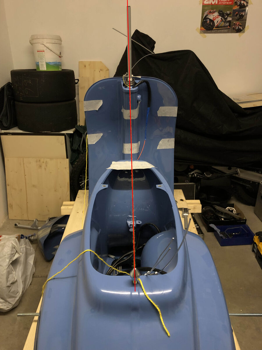 Hab jetzt nochmal die Schnur durch das Gabelrohr gespannt und die Abweichung ist bei ca. 3mm in Fahrtrichtung nach rechts.