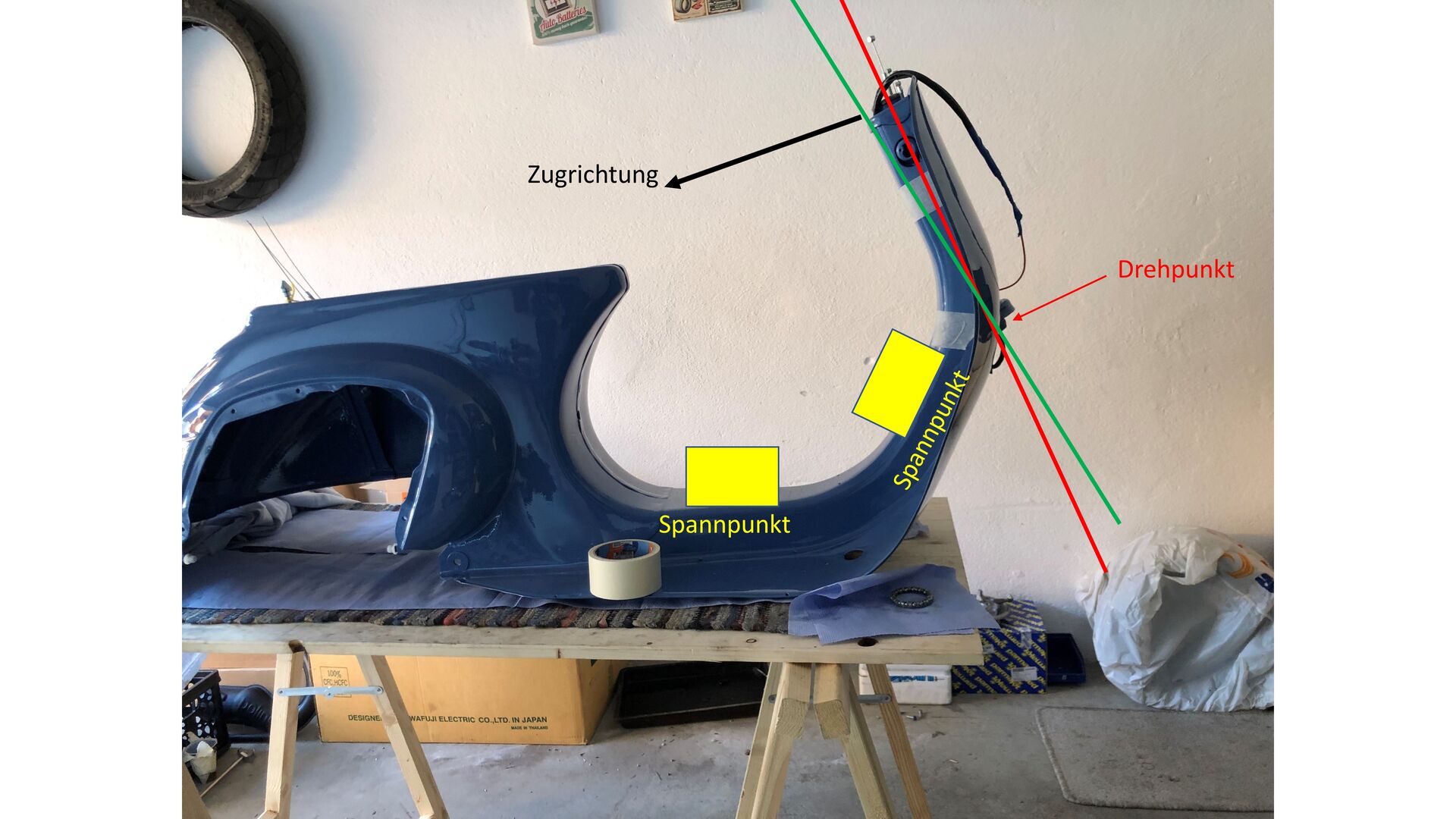 Wenn man den Rahmen nicht spannt und eben nur mit dem Spanngurt wie weiter oben beschrieben steht richten will, hat man eben das Problem, dass aufgrund des Hebelarms, der Rahmen bei der ersten Biegung sich bewegen wird - ich jedoch bräuchte die Biegung in dem von mir eingezeichneten Bereich - somit muss der Rahmen nach der ersten Biegung auch nochmal gespannt werden müssen - sowas geht eben dann nur auf einer Richtbank oder auf einem odentlichen Schweißtisch.