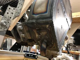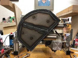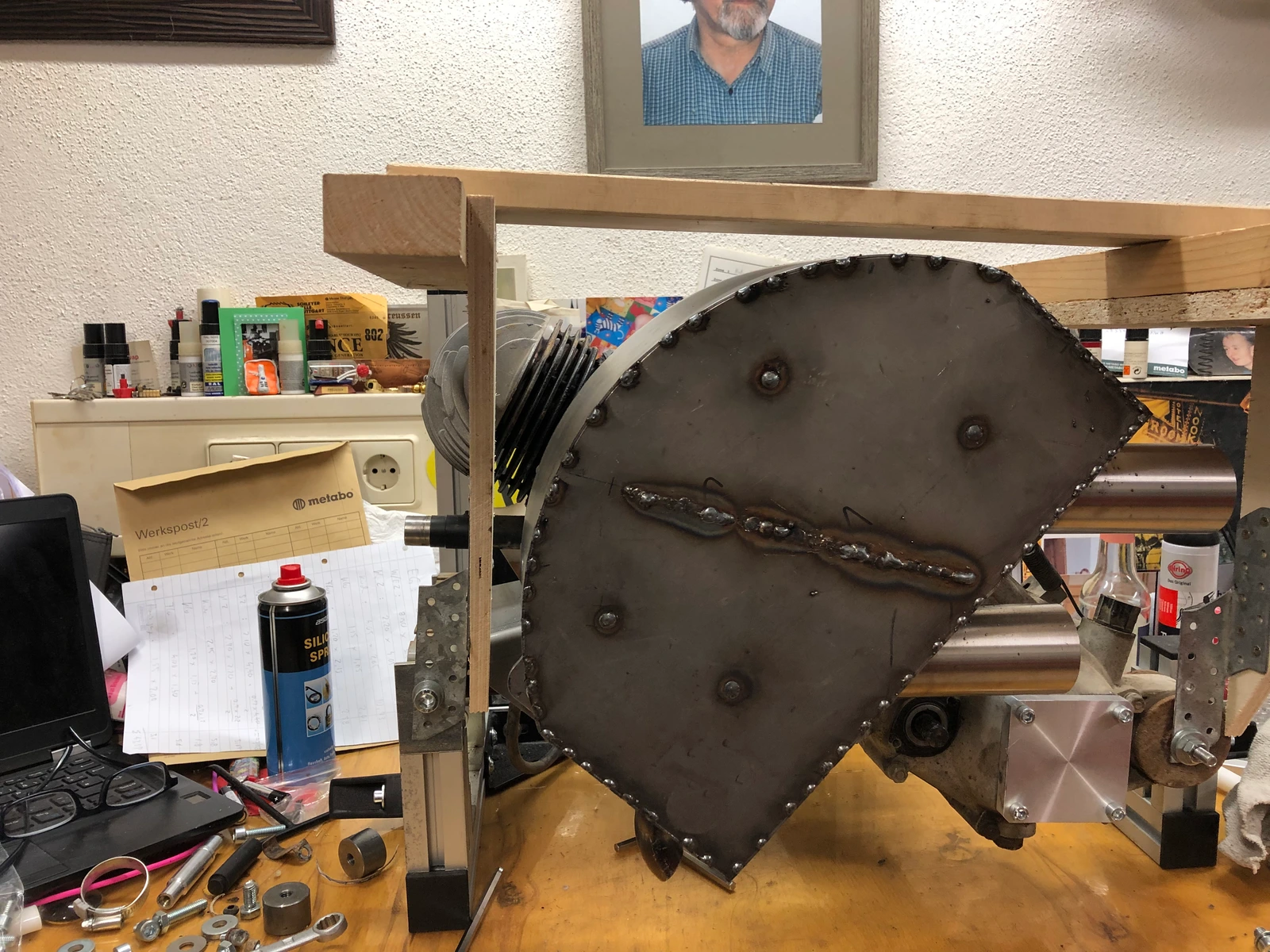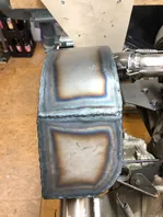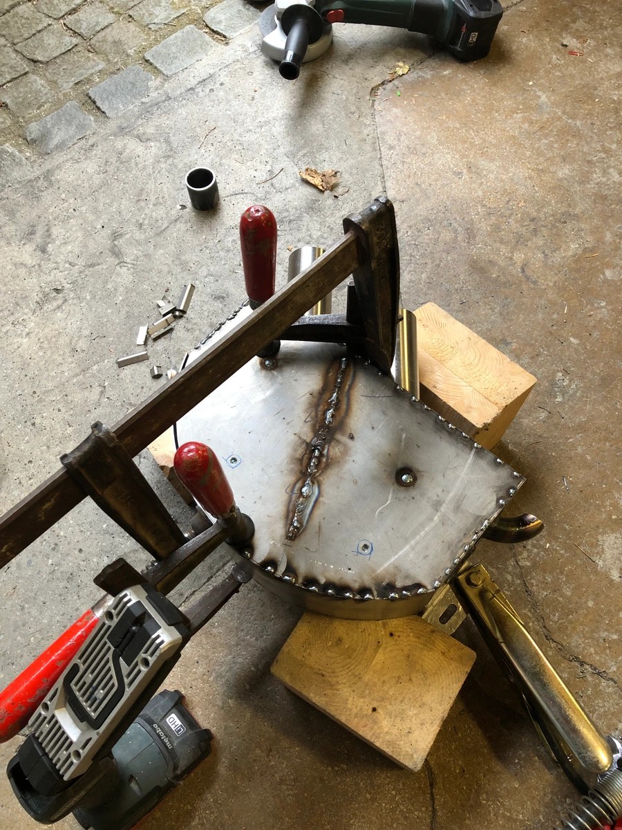 Als ich fertig war mit den Stoßnähten der Hülle, ging ich auf der großen Fläche nochmal über die MAG-Naht drüber, die die innere Trennwand mit dem Deckel verbindet, damit die etwas flacher und schöner wird.