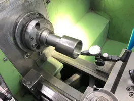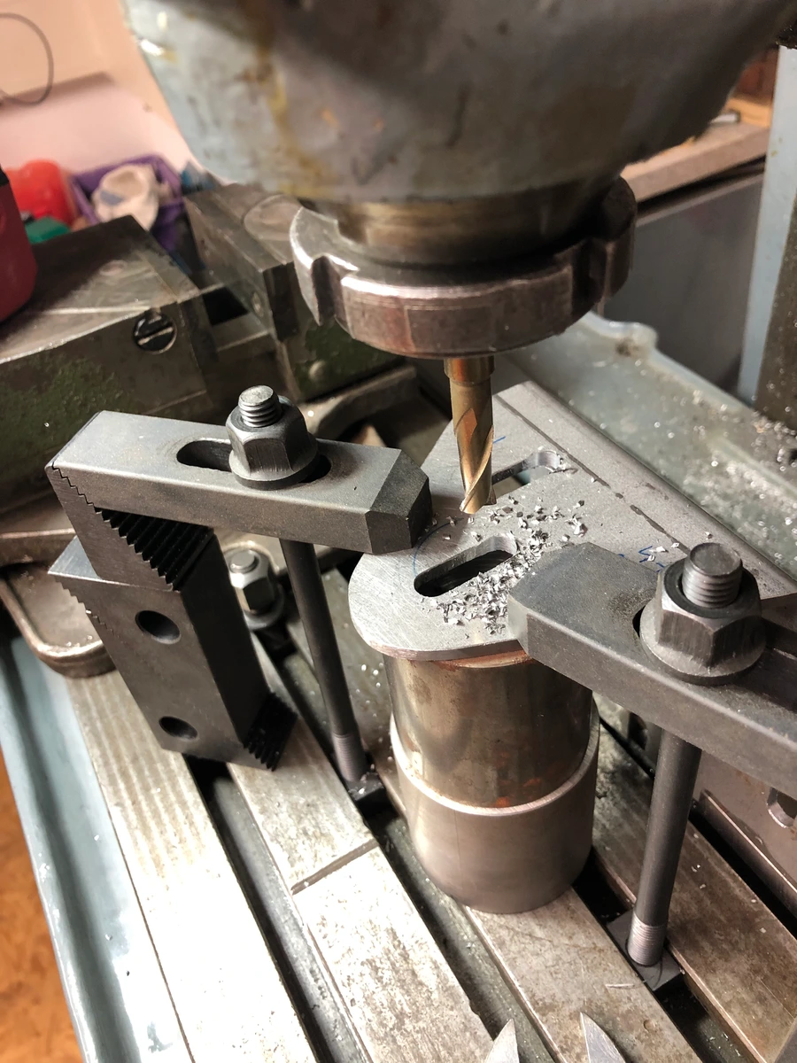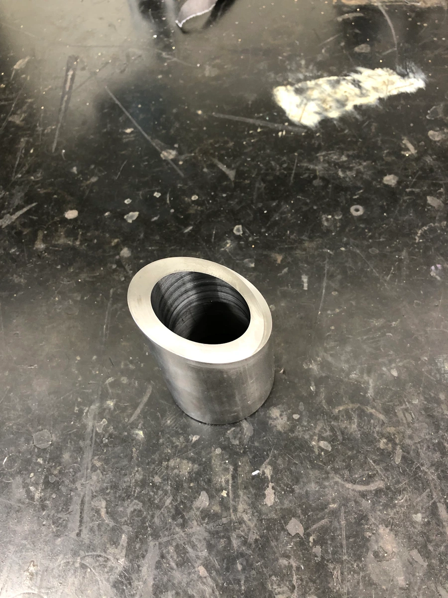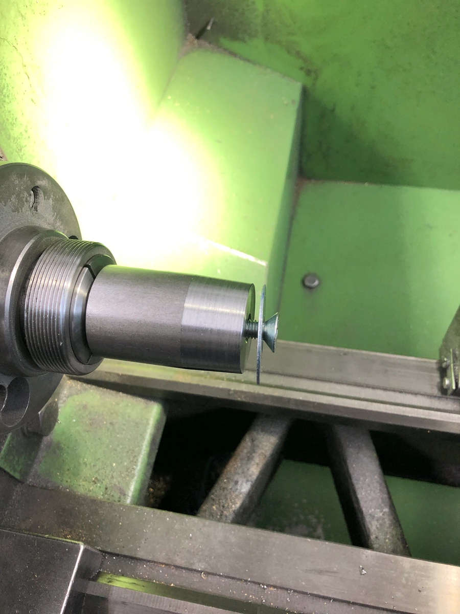 Die Muffe war leider nicht mehr spannbar, nachdem die Schräge dran gefräst war. Die Backentiefe des Futters reicht nicht mehr. Deshalb habe ich mir einen Dorn gedreht, der ebenfalls einen 6° Konus hat und ich die Muffe mit einer Scheibe spannen kann: