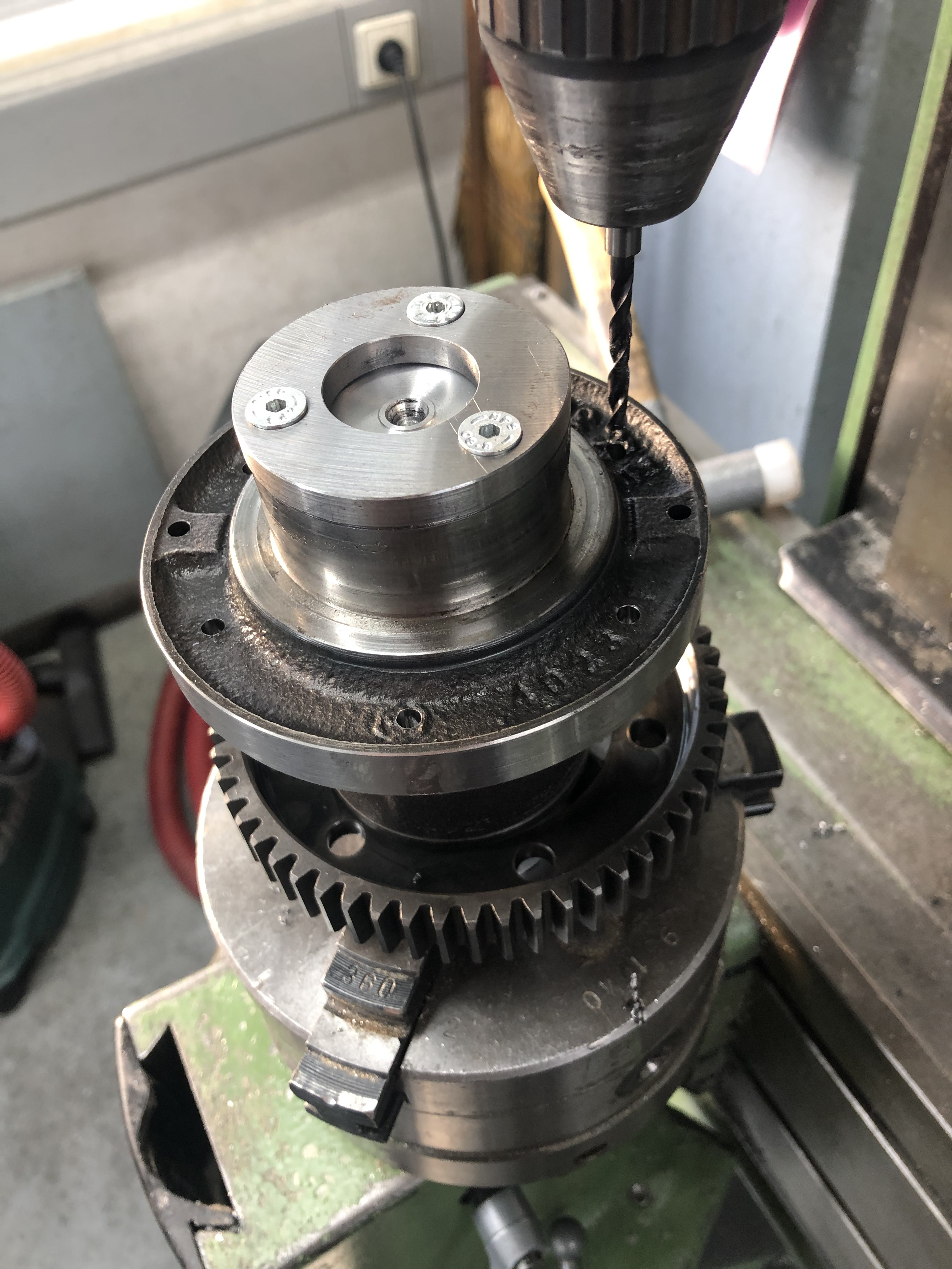 Ich habe dann den Außendurchmesser auf das Zentriermaß des neuen Zahnkranzes überdreht und dann im Anschluß die Position hergestellt: