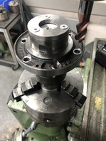 Den Lehrling hatte ich letzte Woche an seinem letzten Tag noch einen Teller mit einem 28er Zapfen drehen lassen, damit ich mir eine Vorrichtung für die Spannzange machen kann, um die harten Scheiben innen auszudrehen. Ich habe dann den 70er Außendurchmesser eingedreht, innen etwas ausgekesselt und außen 3 Gewinde gesetzt auf dem Teilapparat, um die Scheiben spannen zu können.