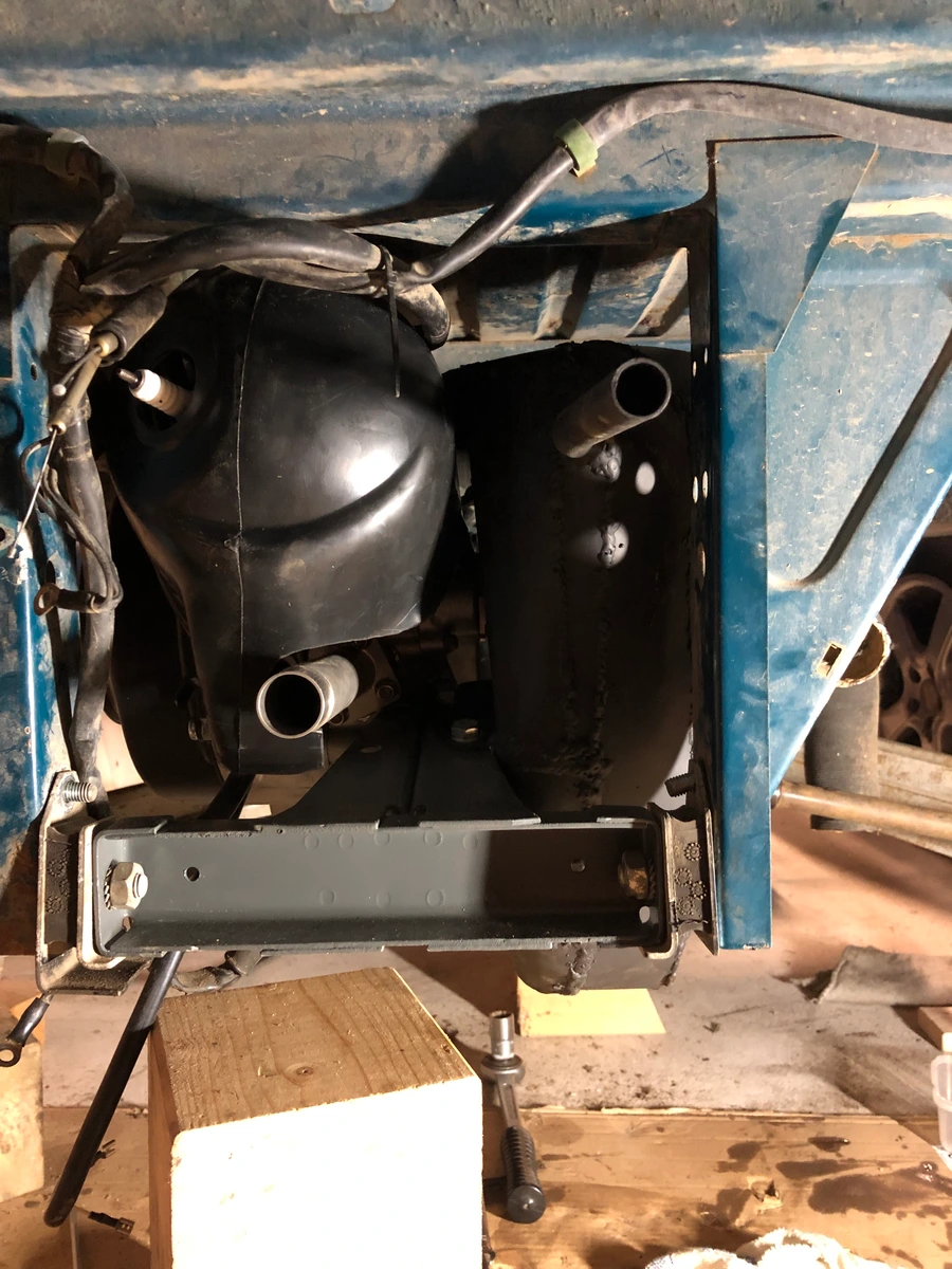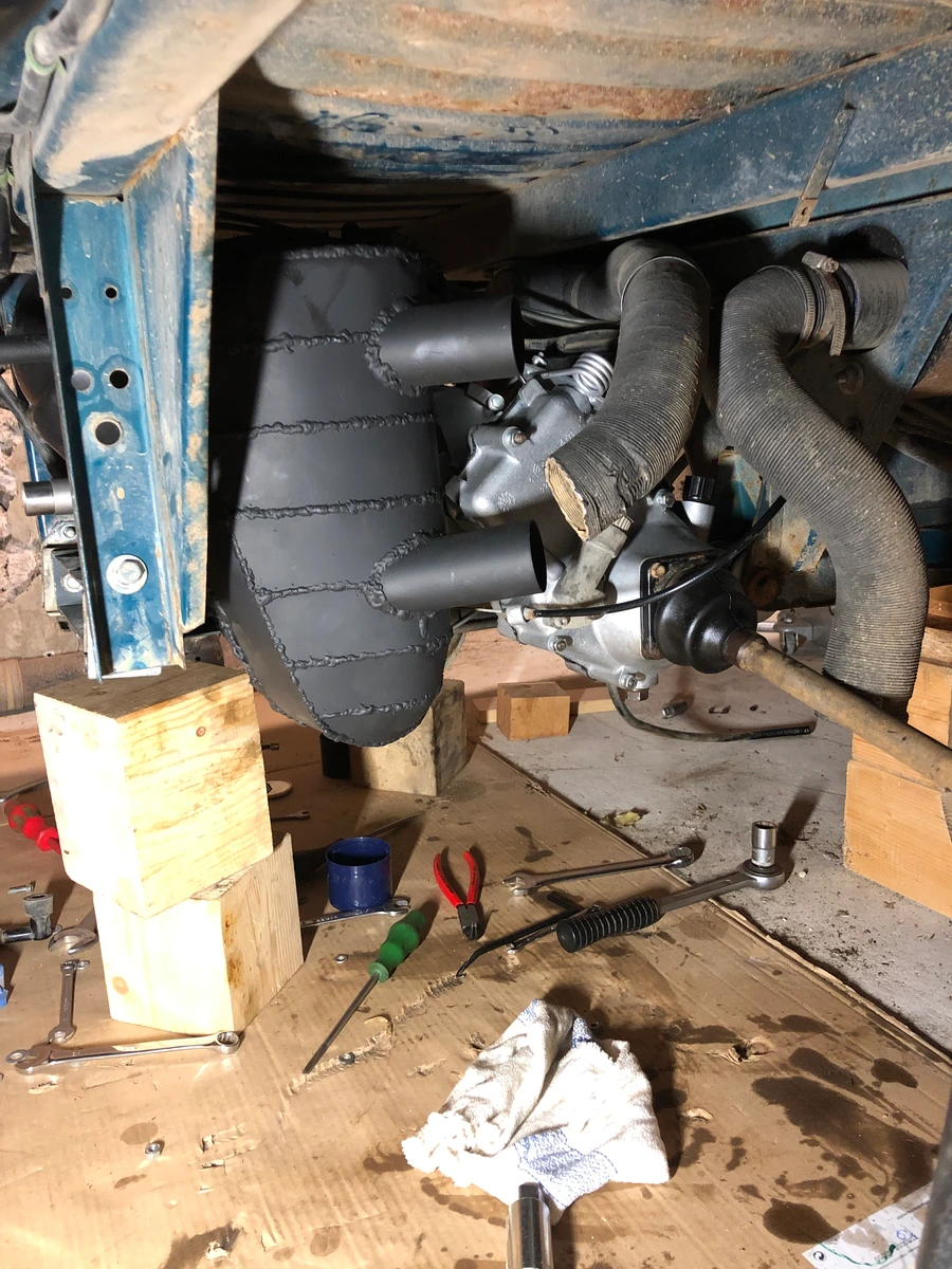 Unter der Pritsche ist ja noch dieses Ansaugrohr. Wenn man das entfernen will, muß man glaube ich Schweißpunkte aufbohren oder so. Deshalb hatte ich das mal aufgetrennt und mit einer Muffe wieder verbunden. So ist es abnehmbar.