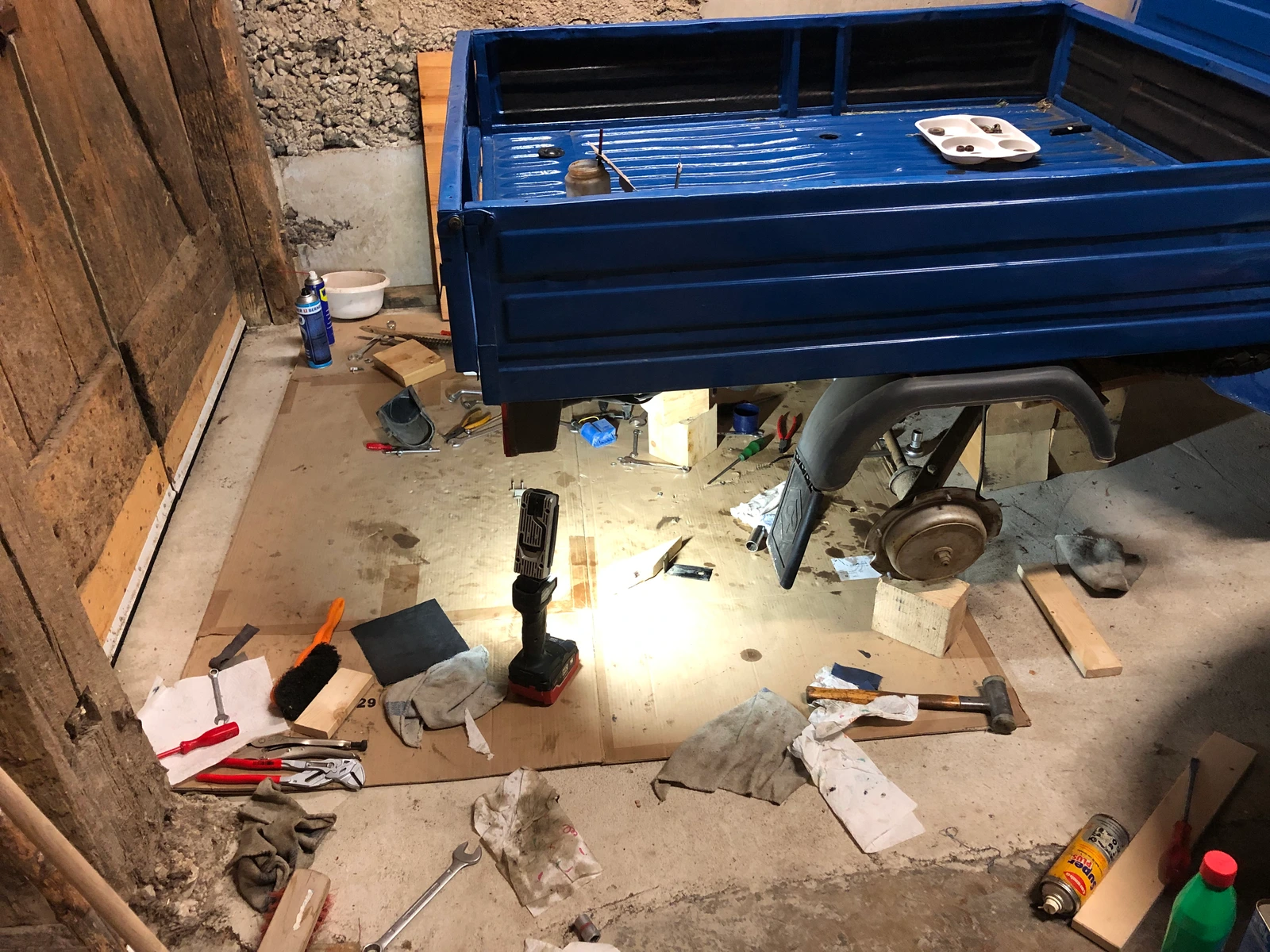 heute war nicht mein Tag. Zuerst ziemlich stümperhaft die Ape etwas höher auf Holzklötze gesetzt...Dann ging damit los, daß ich meinen Akku-Schlagschrauber abgeraucht habe. Ich bin zu den Akkus und nehme den einzigen mit 36 Volt. Stecke den ein auf dem Rückweg zur Ape und denke, wieso geht der nicht rein. Ein beherzter Schlag hinten drauf und ich habe die Codierung überbrückt...