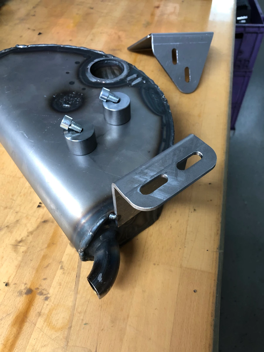 Zwei Gummipuffer-Dummys aus Stahl gemacht, damit der Briefkasten starr hängt für die Krümmeranpassung und zwei Winkel gemacht auf Basis meiner Karton-Schablonen.